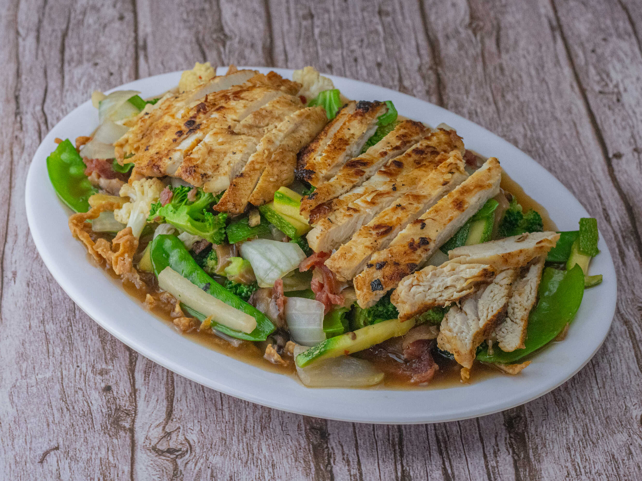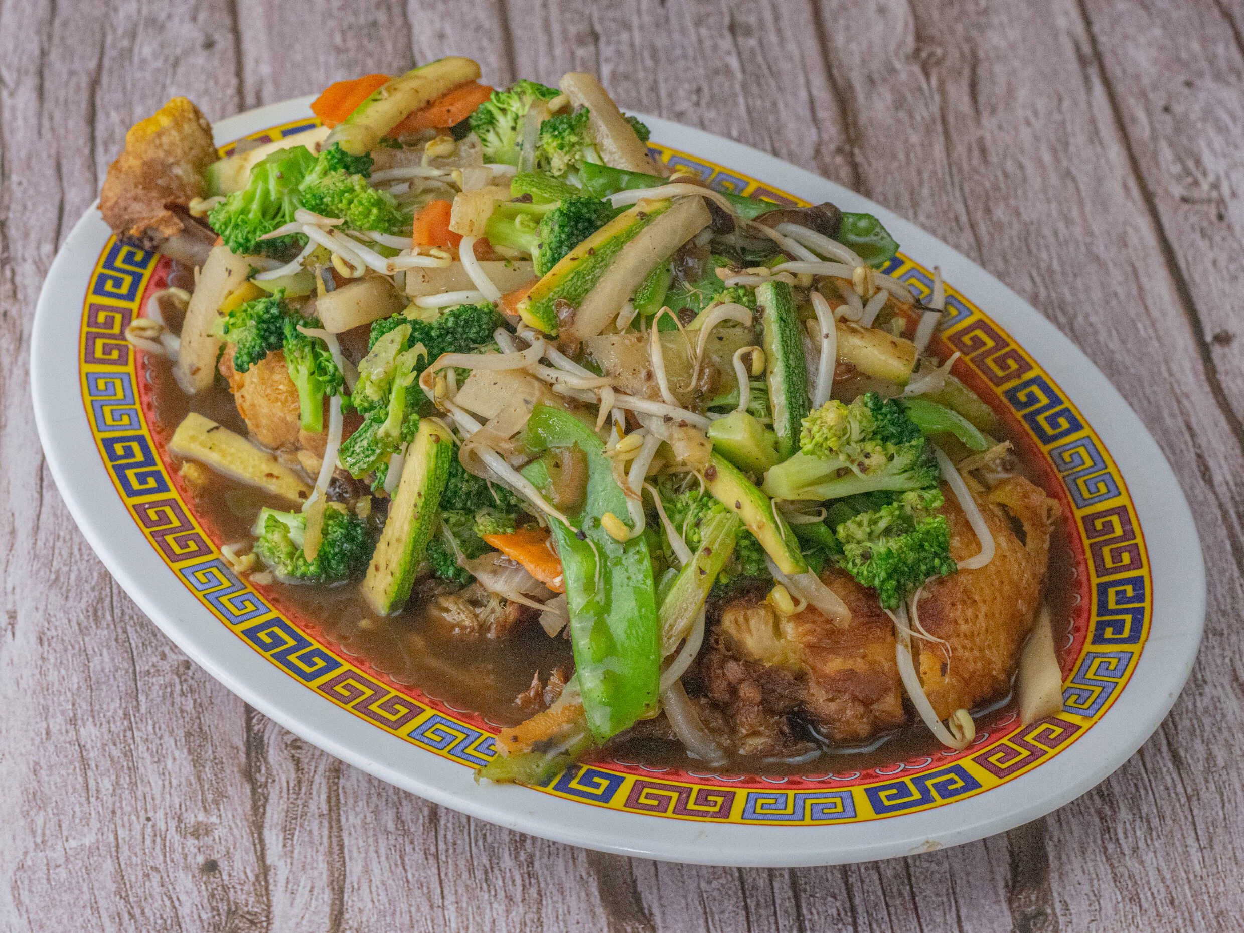 Pollo frito dorado cubierto con una combinación de vegetales cocinados en salsa de ostión.
