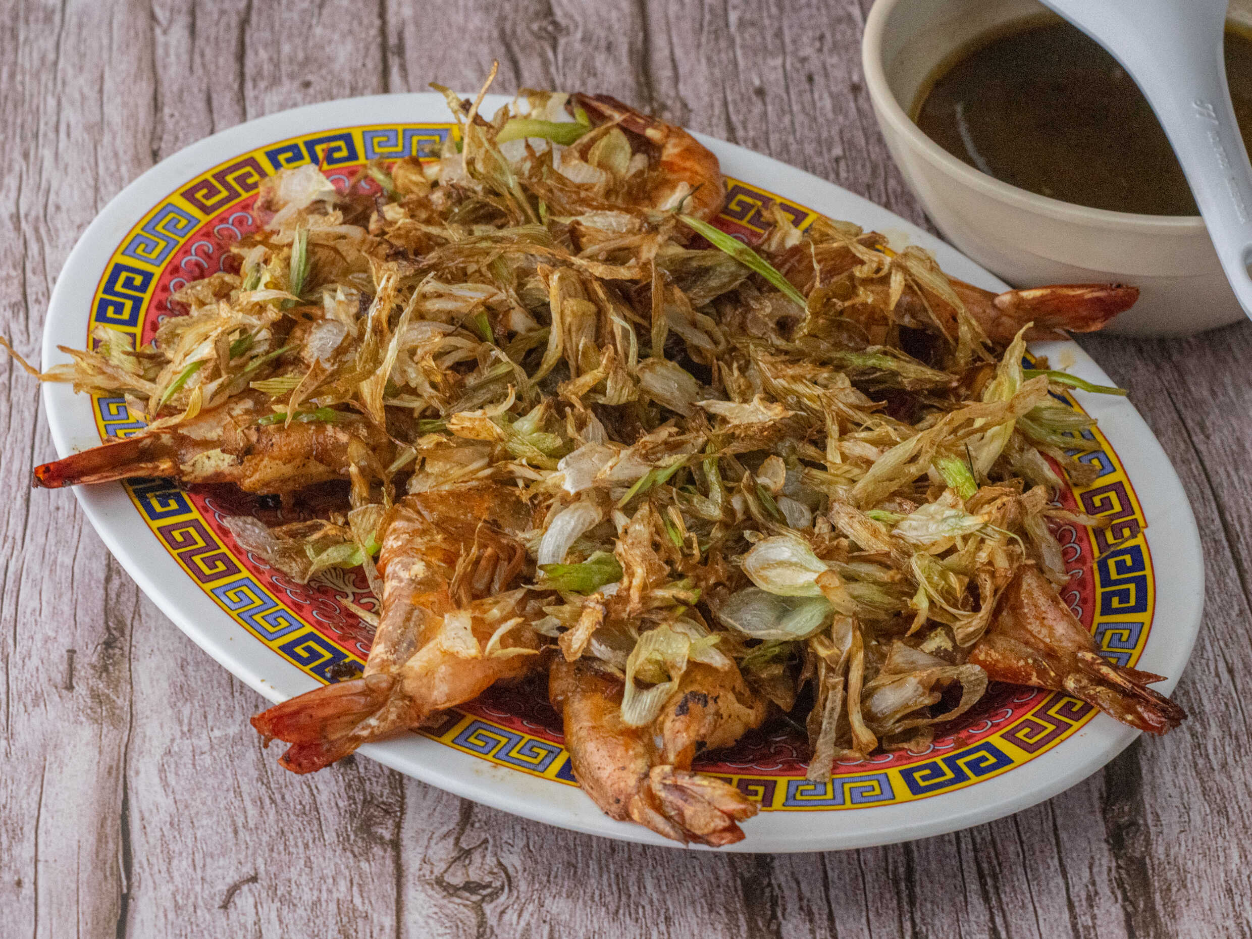 Camarones mariposa cocinados a la plancha coronados con cebolla cambray dorada y una mezcla de salsas de la casa sazonadas con ajo finamente picado.