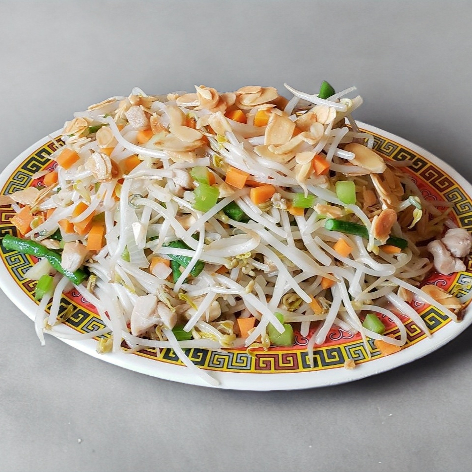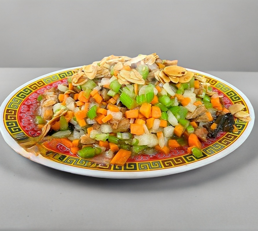 Muslo y pierna de pollo picadas en pequeños pedazos guisados con zanahoria, cebolla, apio, jícama y almendras doraditas.