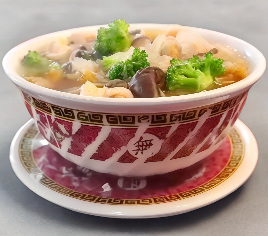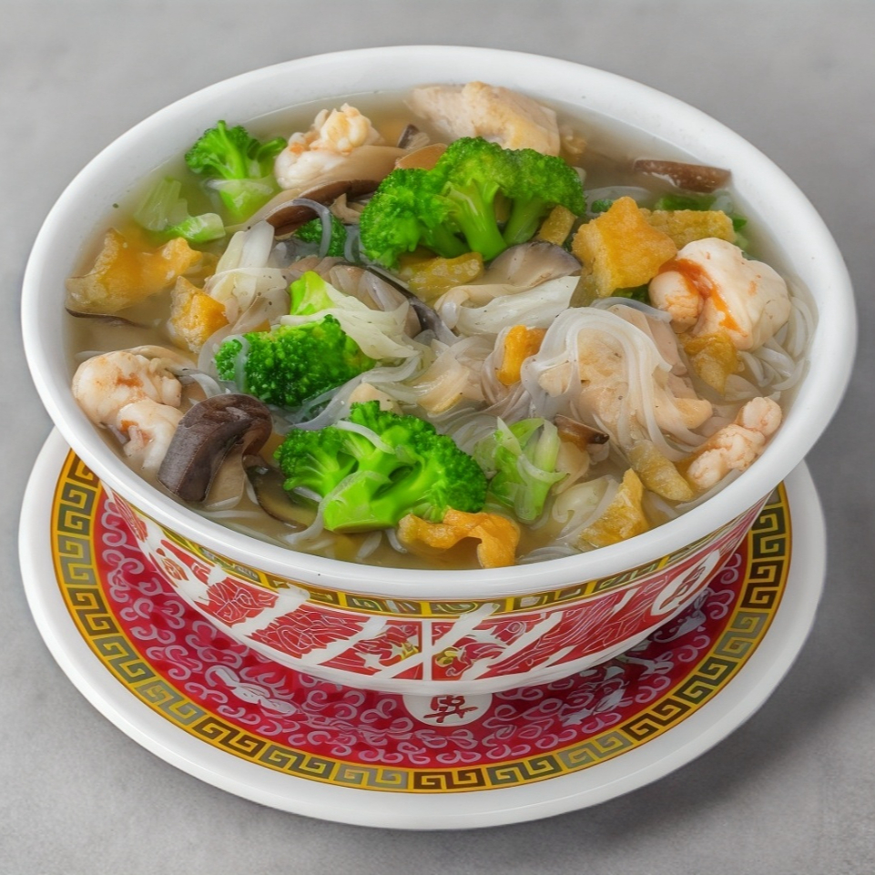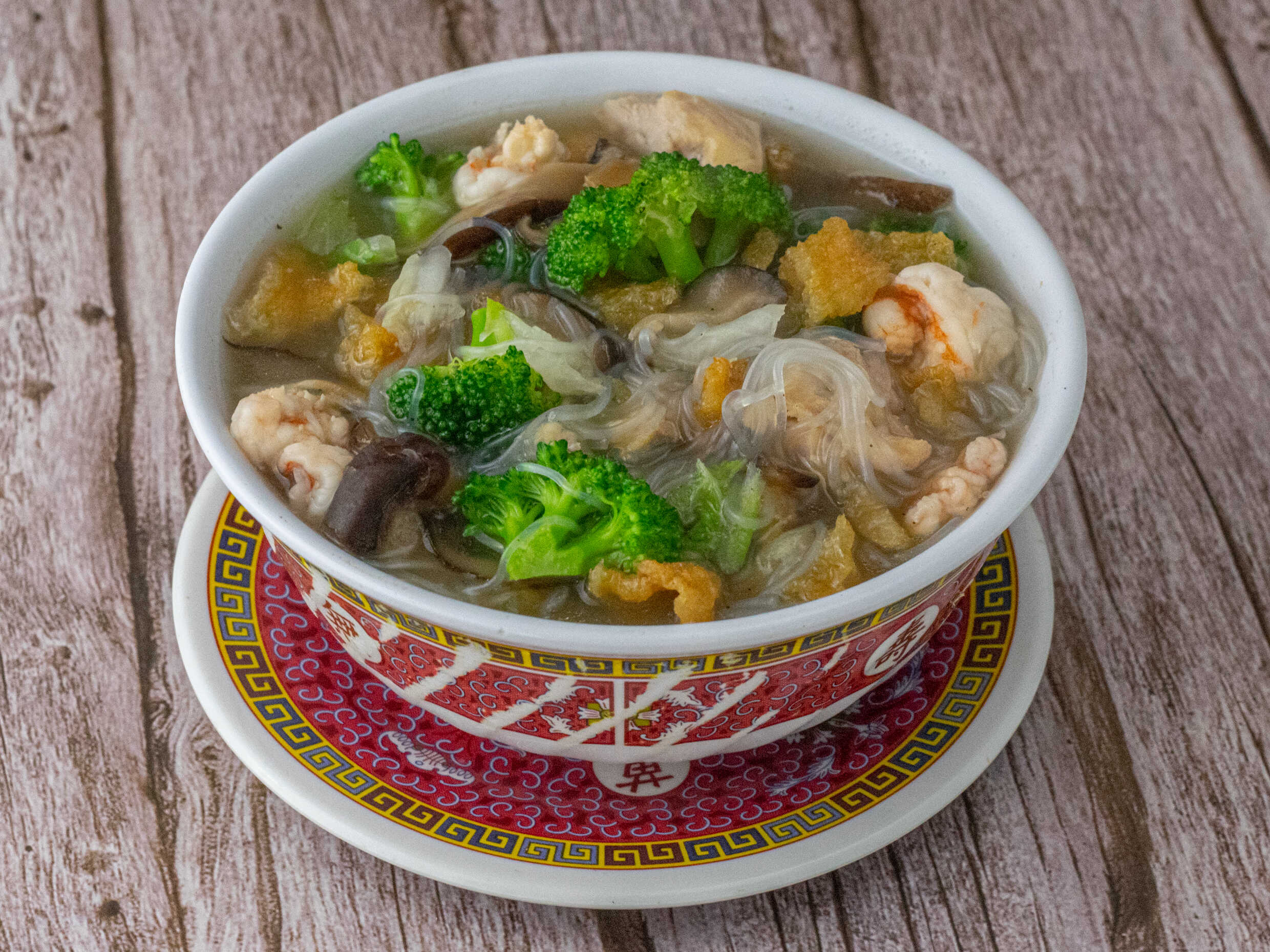La más completa, incluye pollo, camarón, fansí, hongo shitake, buche de pescado y vegetales.