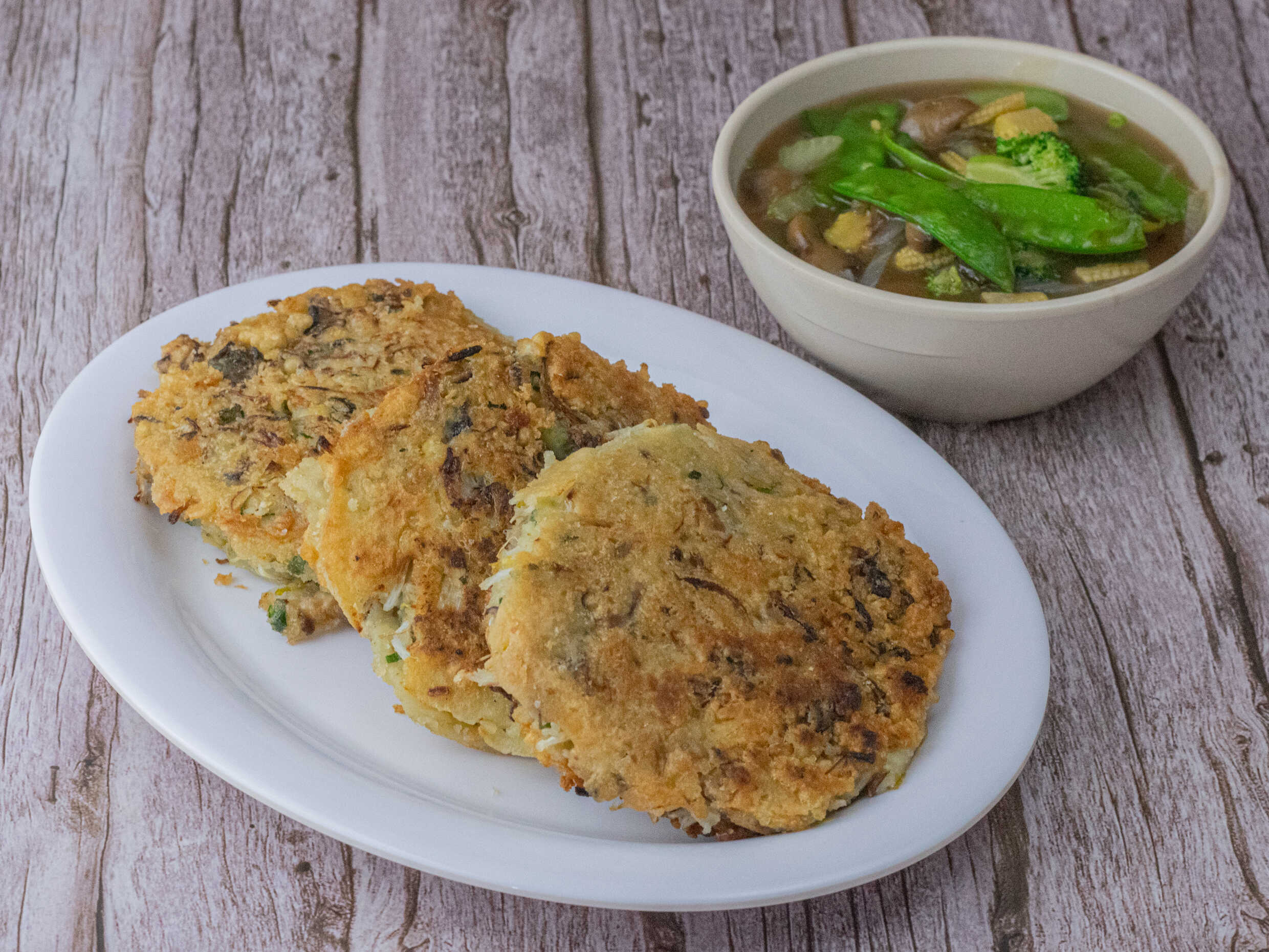Reinventamos las clásicas tortitas, una mezcla muy artesanal de huevo, chopsuey, cebollín y champiñones con la proteína de tu elección, cocinadas a la plancha, hasta quedar doraditas y acompañadas de una combinación de vegetales en salsa de ostión.