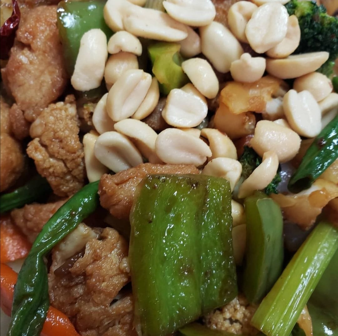 Cubos de pechuga de pollo con una variedad de vegetales, chile de árbol, cacahuate y una mezcla especial de diferentes salsas y especies.