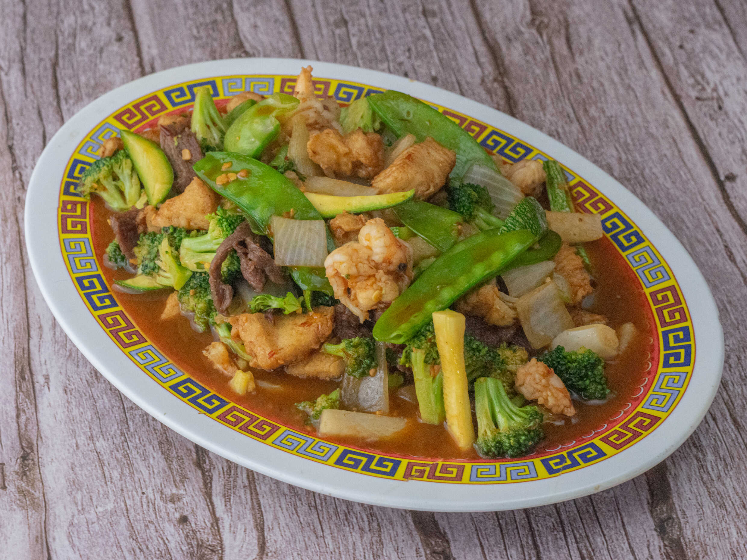 El clásico de clásicos, platillo que incluye prácticamente todas las verduras cocinadas en salsa de ostión, camarones, pollo, carnitas y chorizo chino.