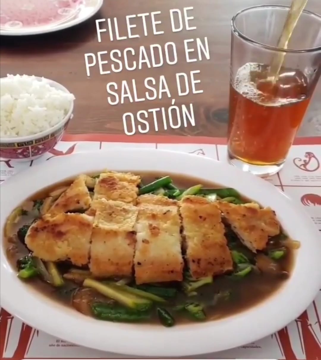 Filete de pescado rebosado, cocinado a la plancha y servido sobre una cama de vegetales cocinados en salsa de ostión.