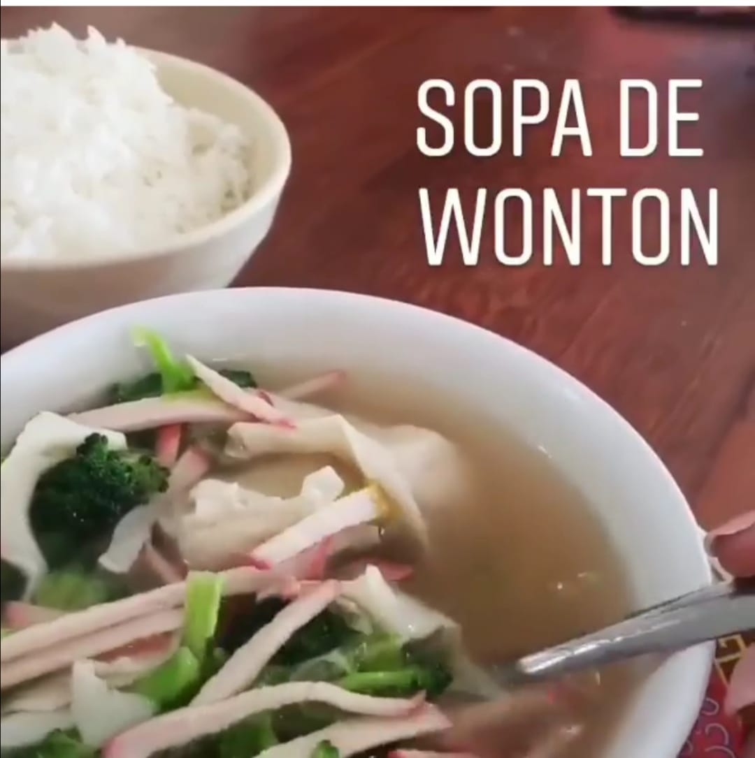 Sopa de won ton con vegetales y tallarín hecho en casa.