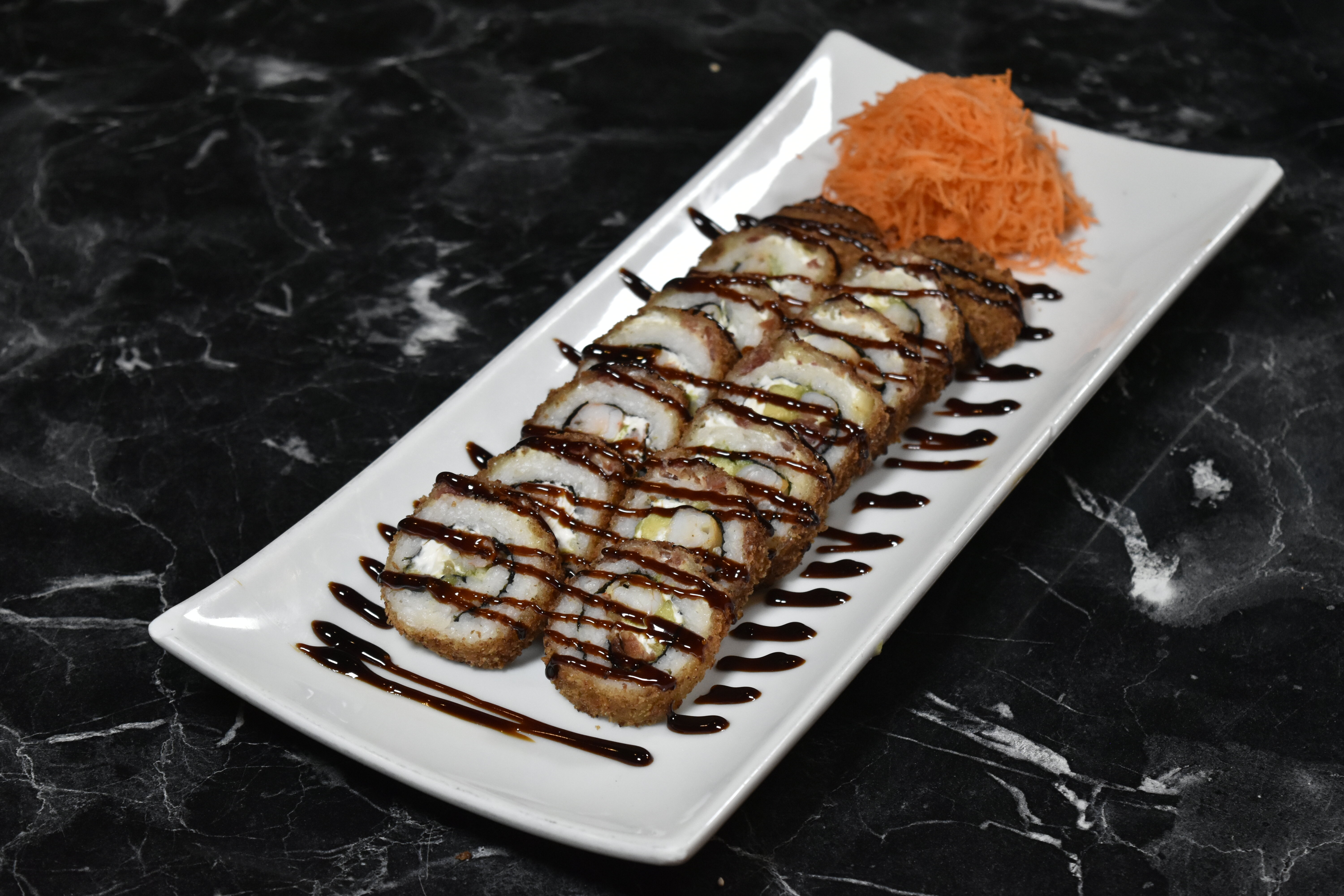 Res, queso philadelphia y aguacate por dentro, topping de spicy ranch, camaron empanizado y salsa de anguila.