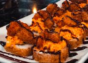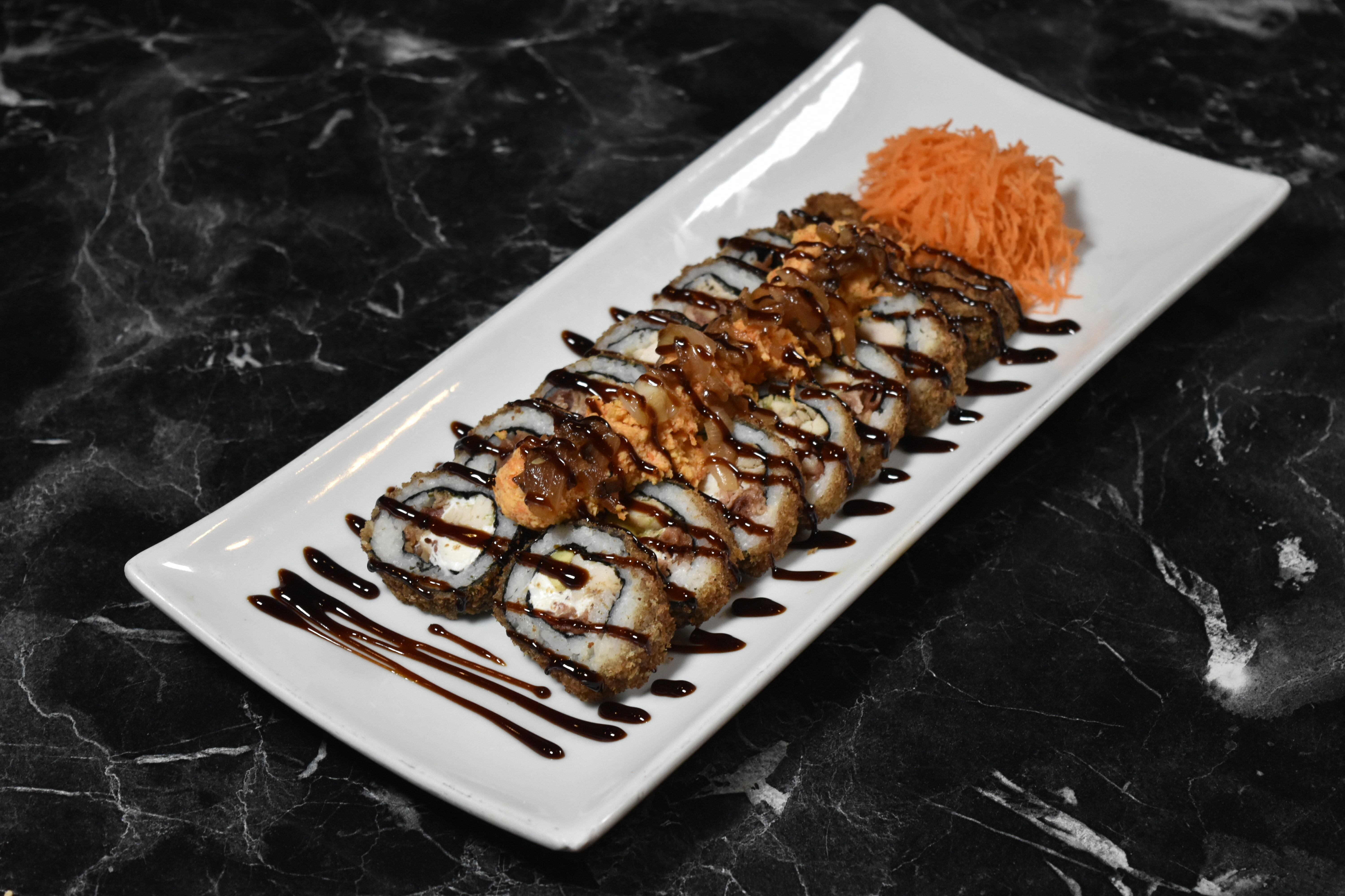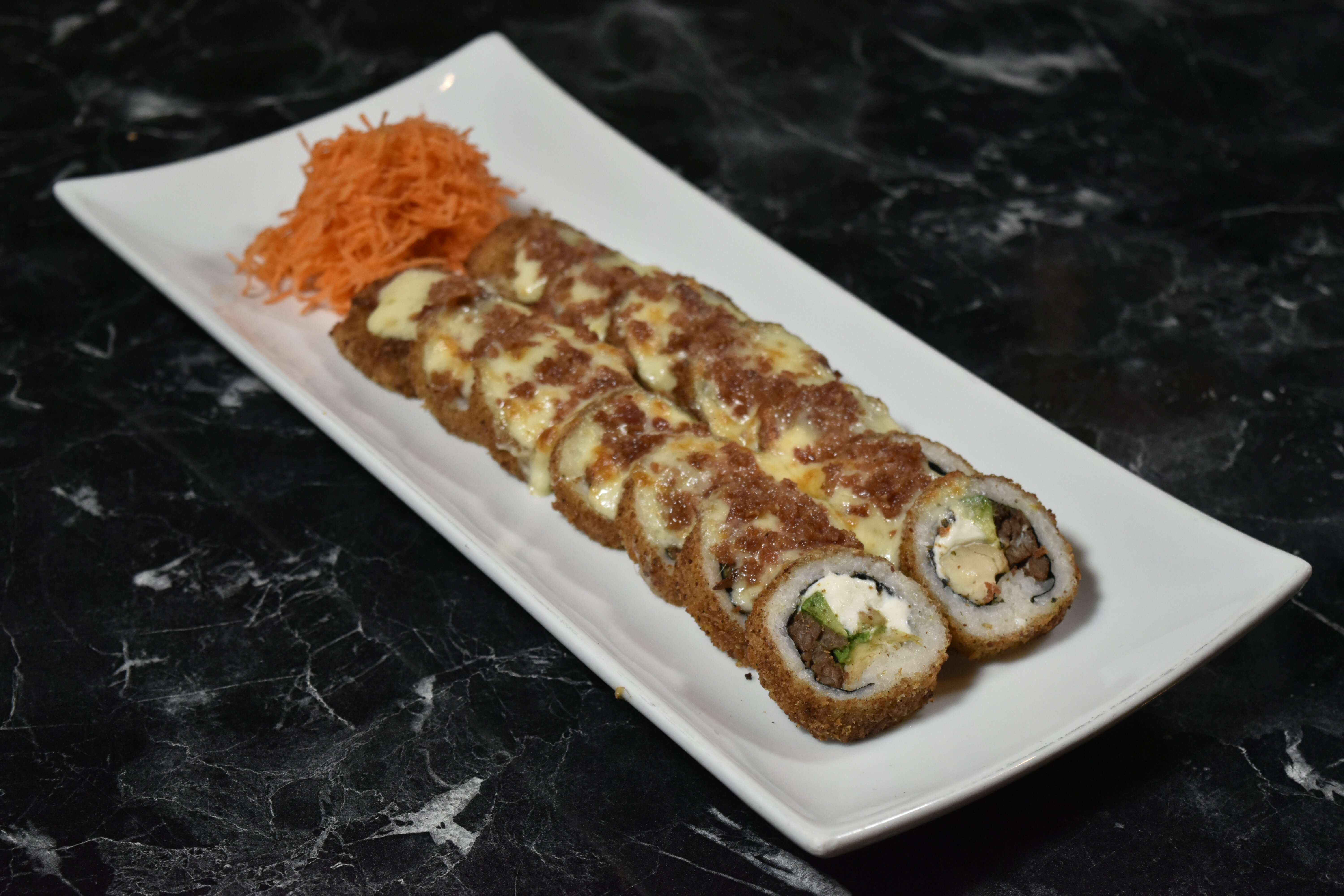 Rollo empanizado horneado, con res, cangrejo, philadelphia, aguacate y pepino por dentro. Queso gratinado por fuera,cebolla asada y tocino picado con aderezo y salsa de anguila.