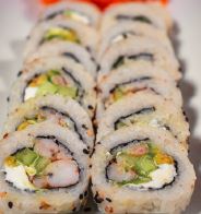 Camarón, res, pollo, queso philadelphia y aguacate por dentro