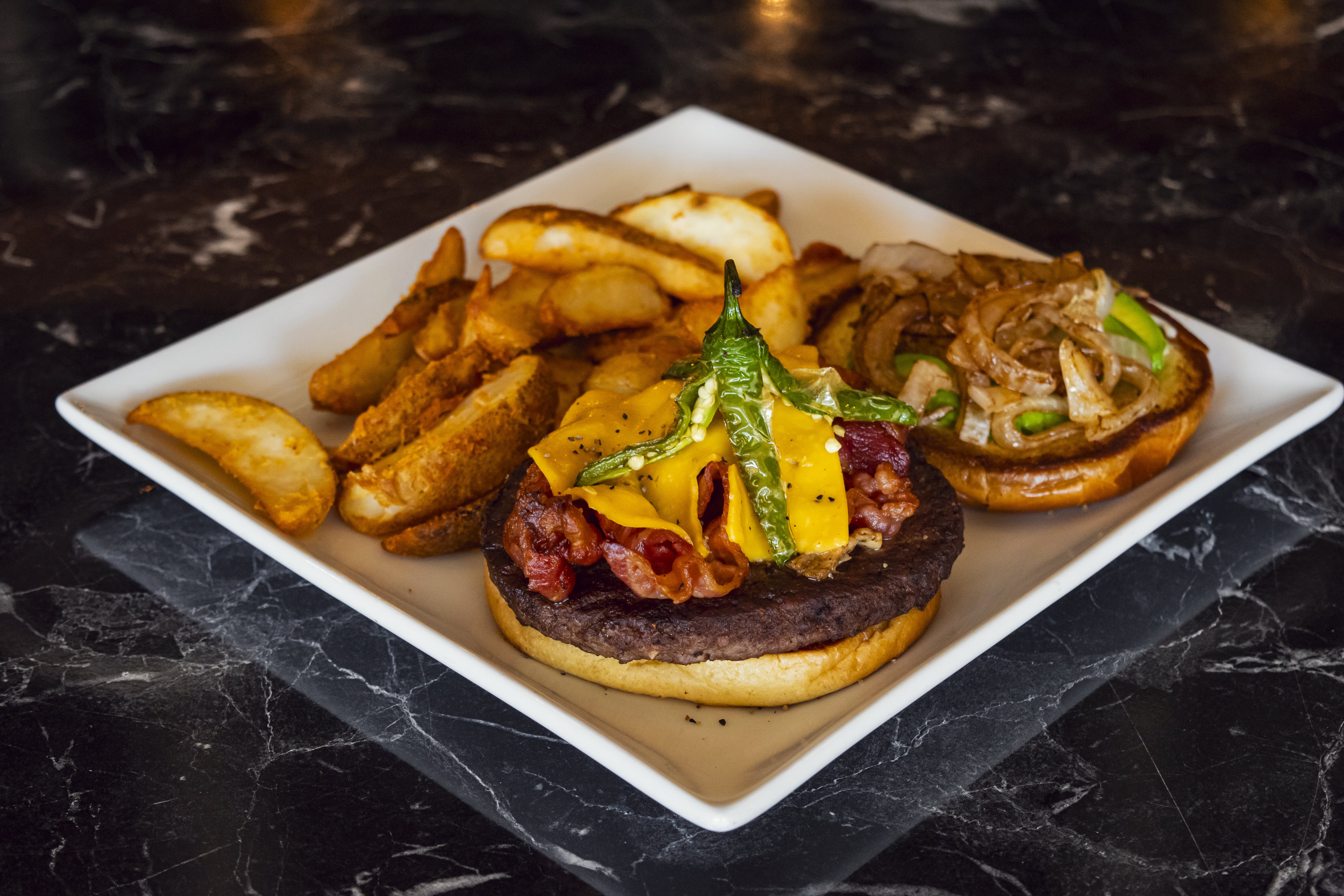 Tocino, cebolla, aguacate, chile serrano, queso americano y papas gajo