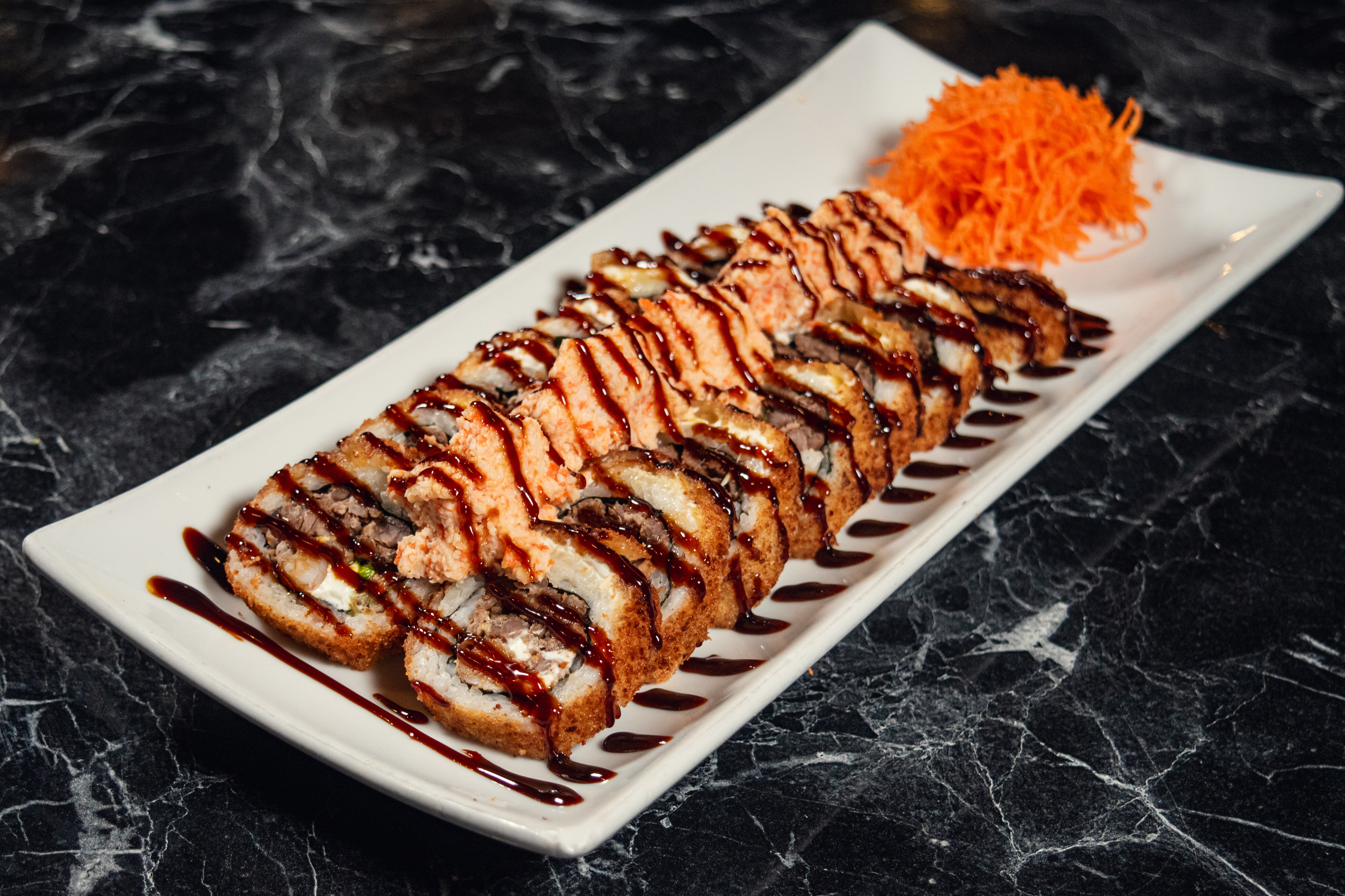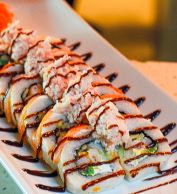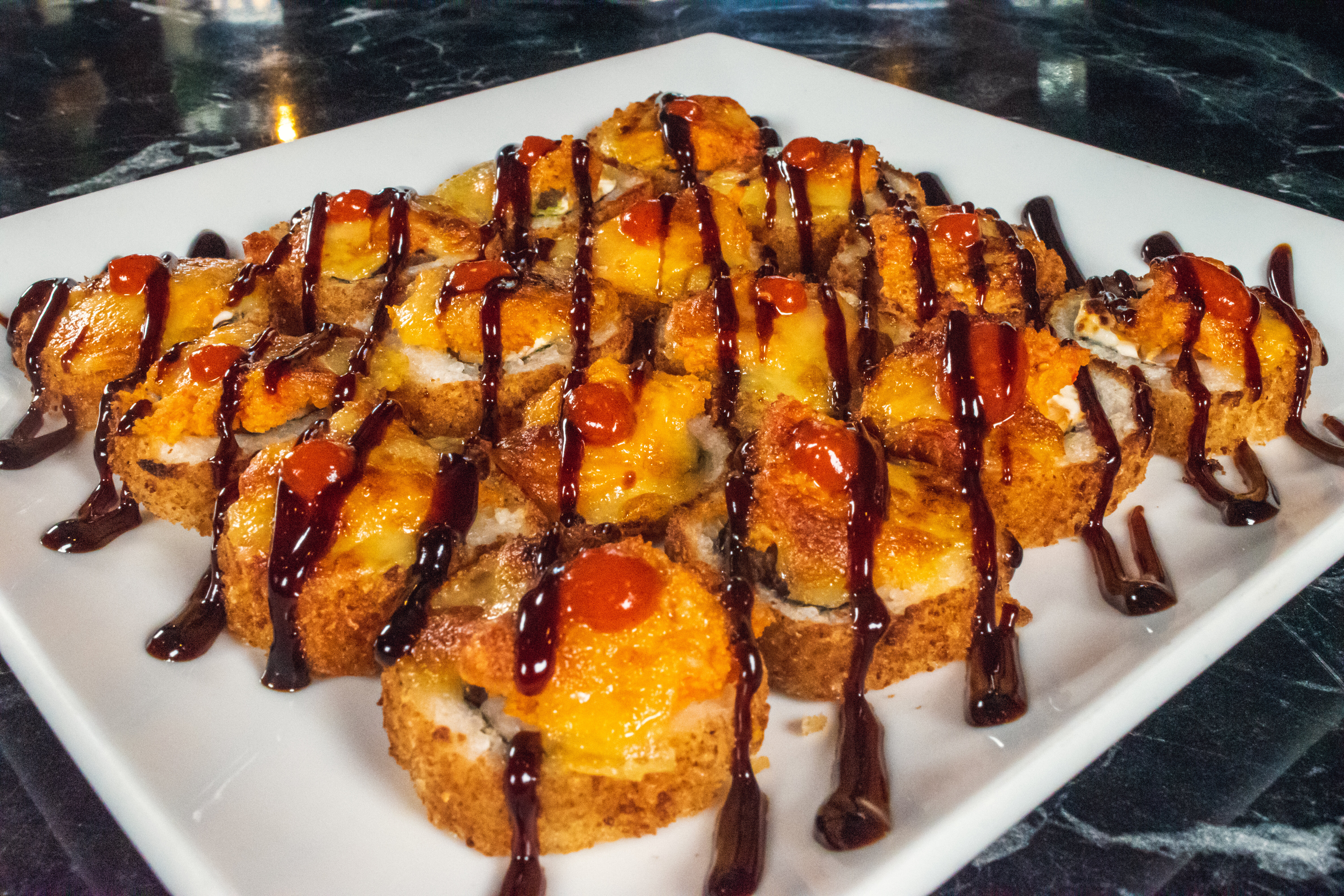 Camarón, res, queso philadelphia y aguacate por dentro, con topping de spicy ranch, salsa roja y salsa de anguila, gratinado