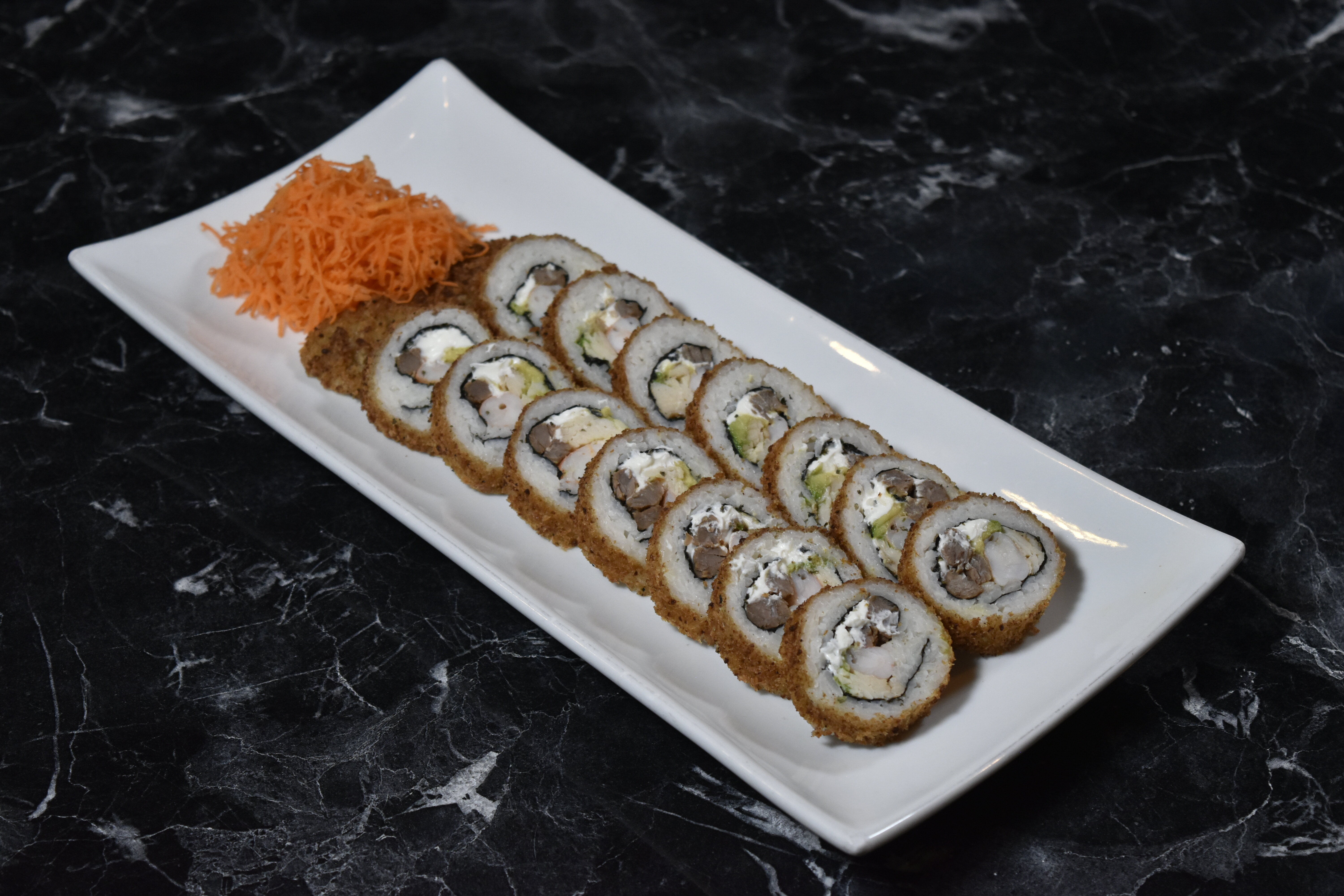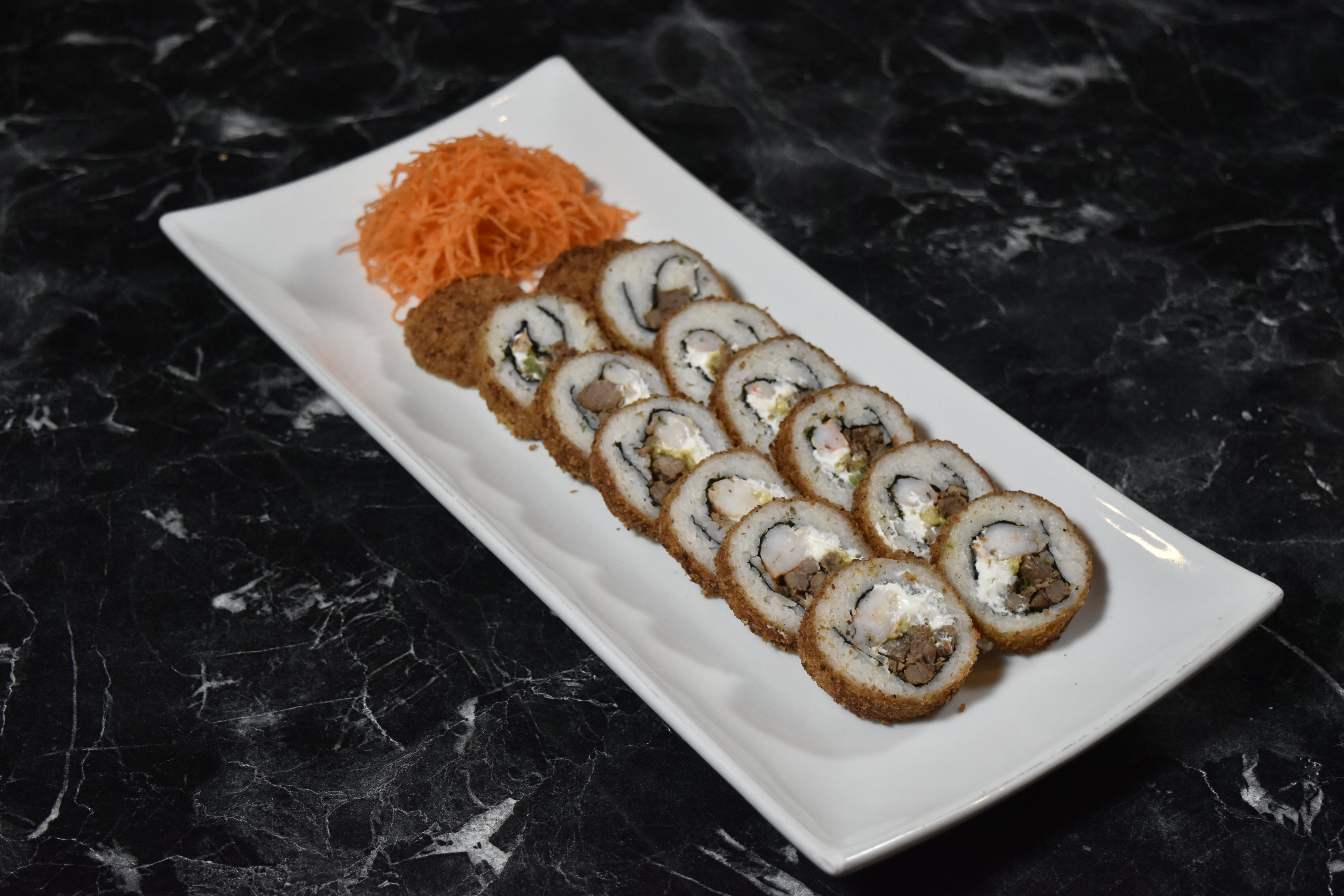¡Un clásico! Camarón, res, queso philadelphia y aguacate por dentro y tres quesos por fuera .