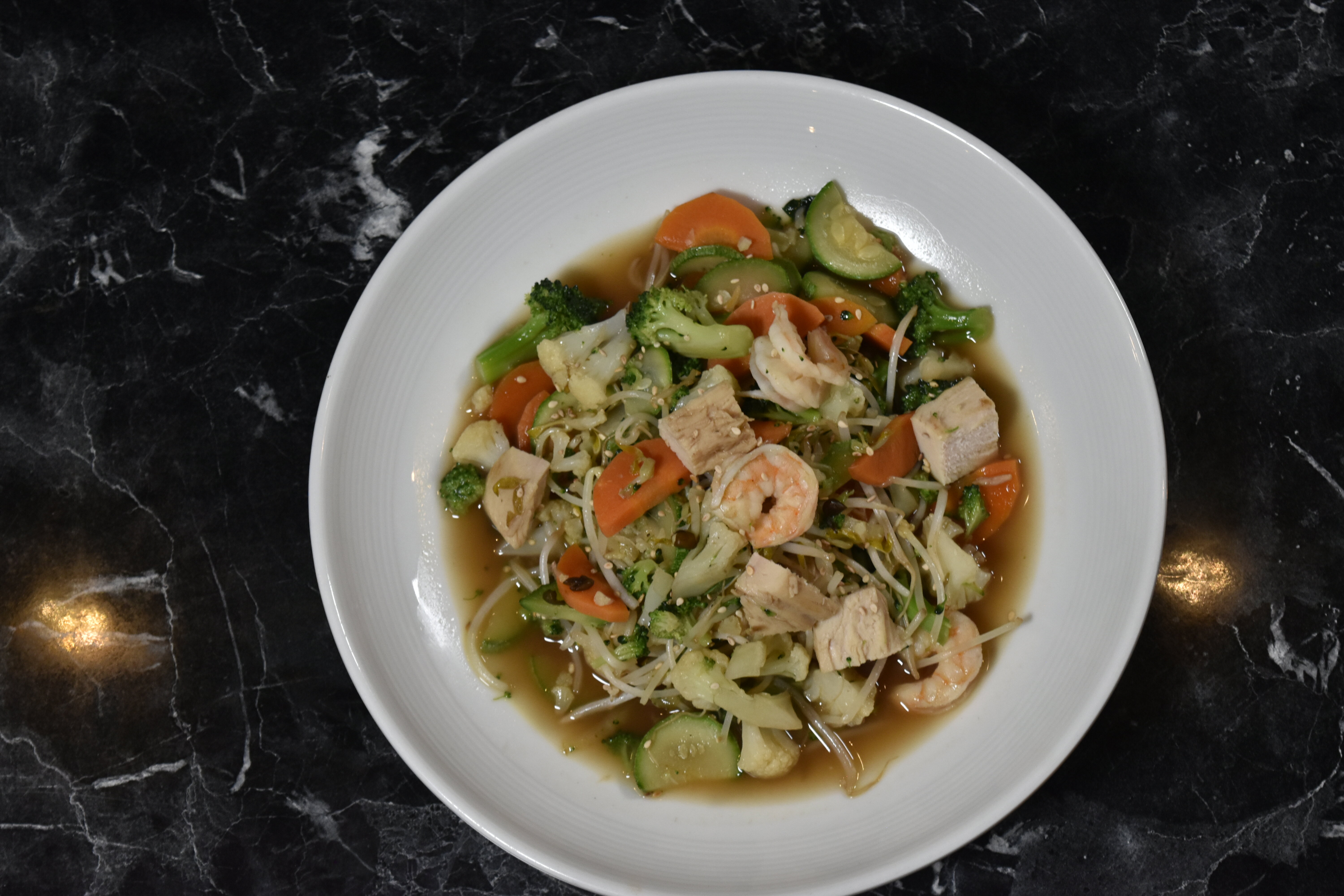 Camarón y pollo en salsa de ostión, salteado con verduras al vapor, (brócoli, coliflor, zanahoria, calabaza, cebolla blanca y frijolillo) en salsa de ostión con ajonjolí