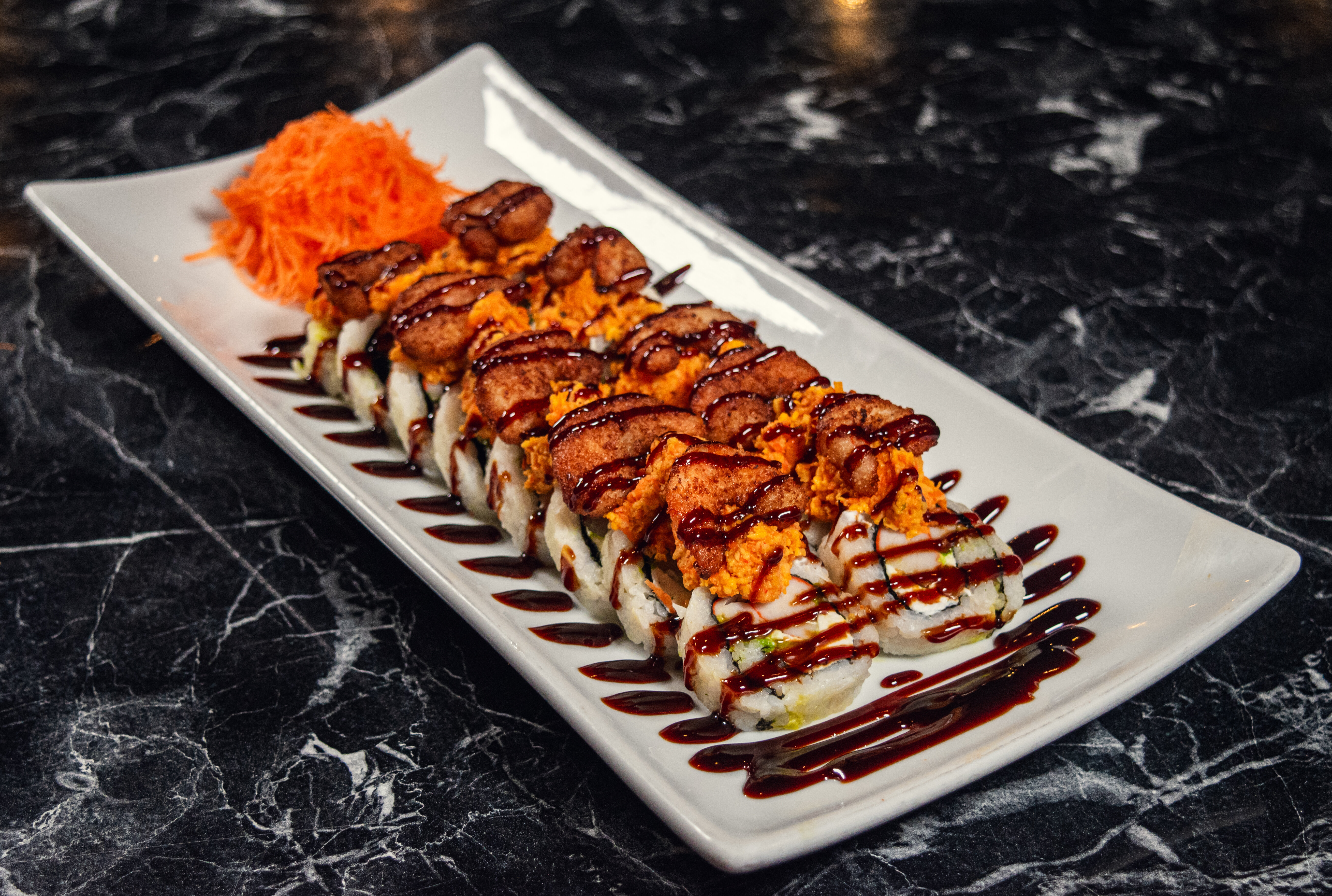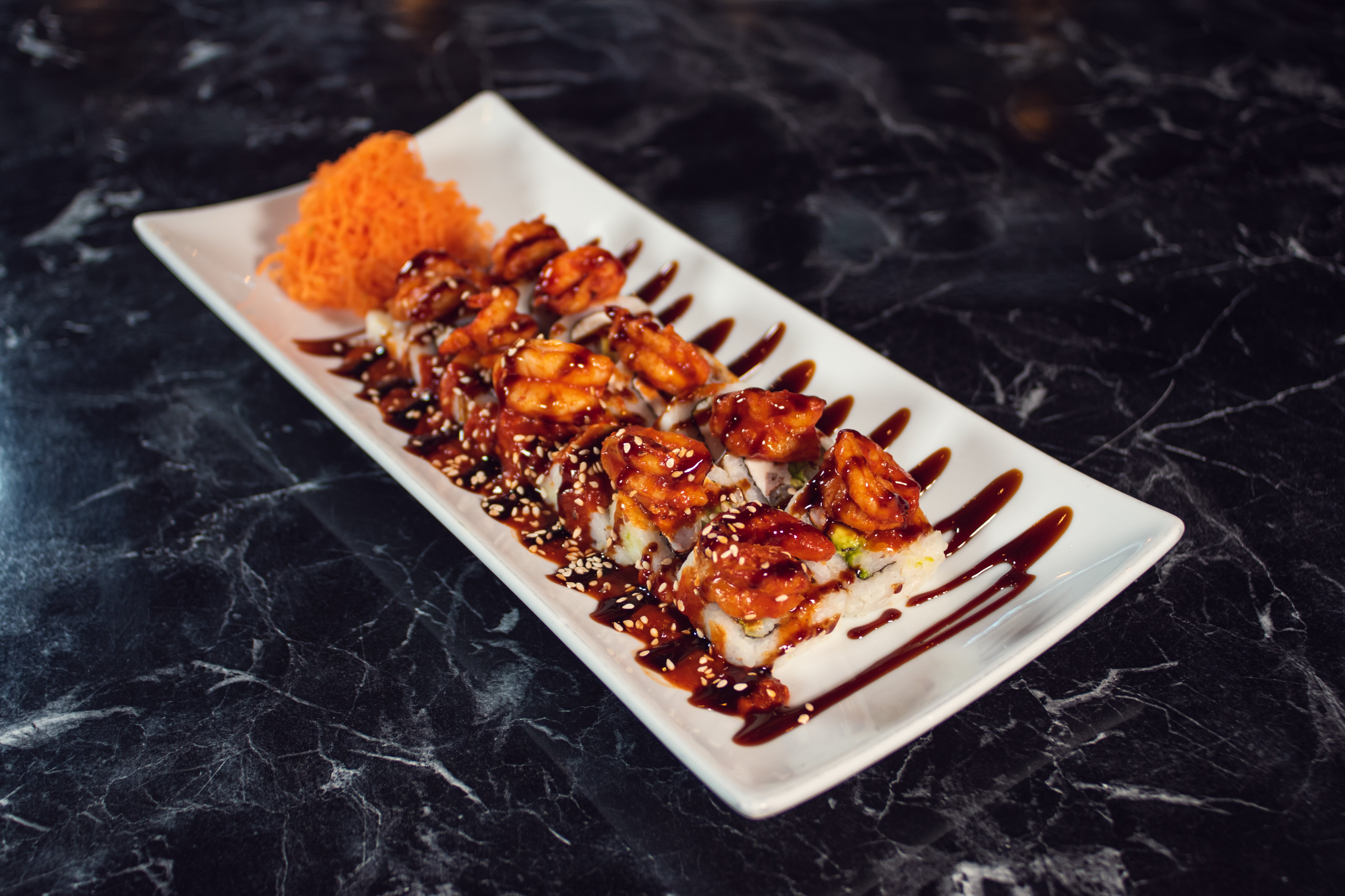 Camarón, queso philadelphia, aguacate y pepino por dentro, topping de camarones a la diabla, salsa de anguila y ajonjolí.