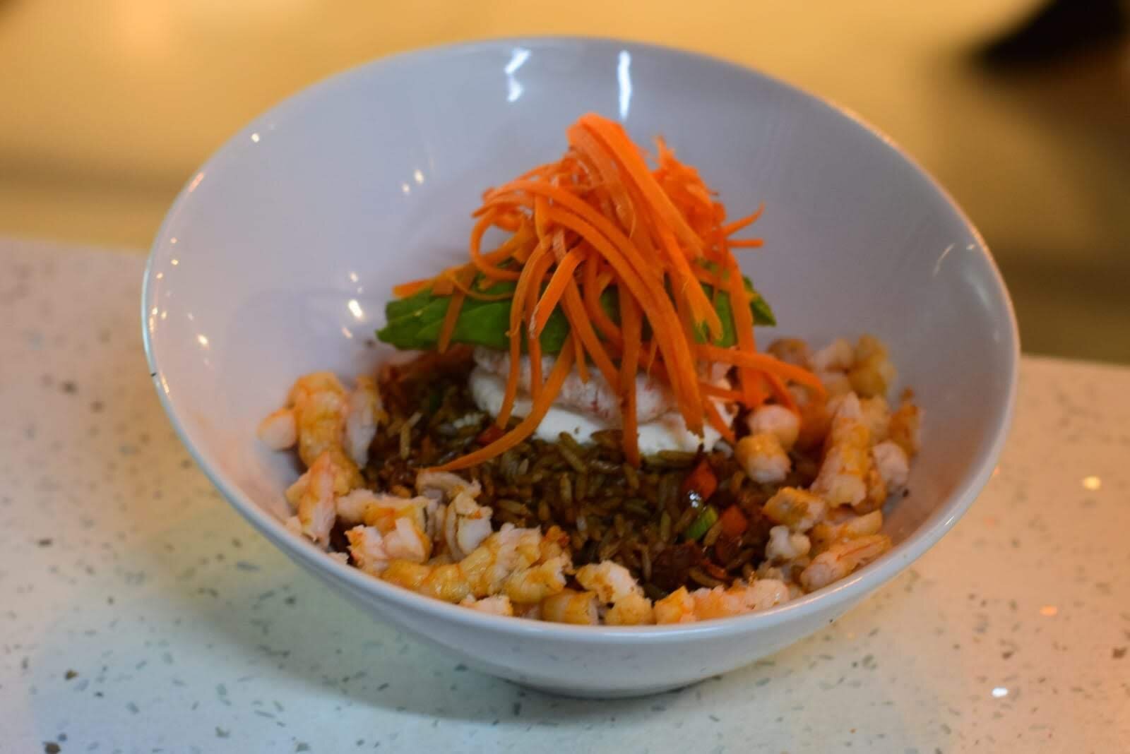 Arroz frito con res, pollo, tocino. zanahoria, calabaza, cebollín y apio. Topping de queso philadelphia, tampico, zanahoria, aguacate y ajonjolí