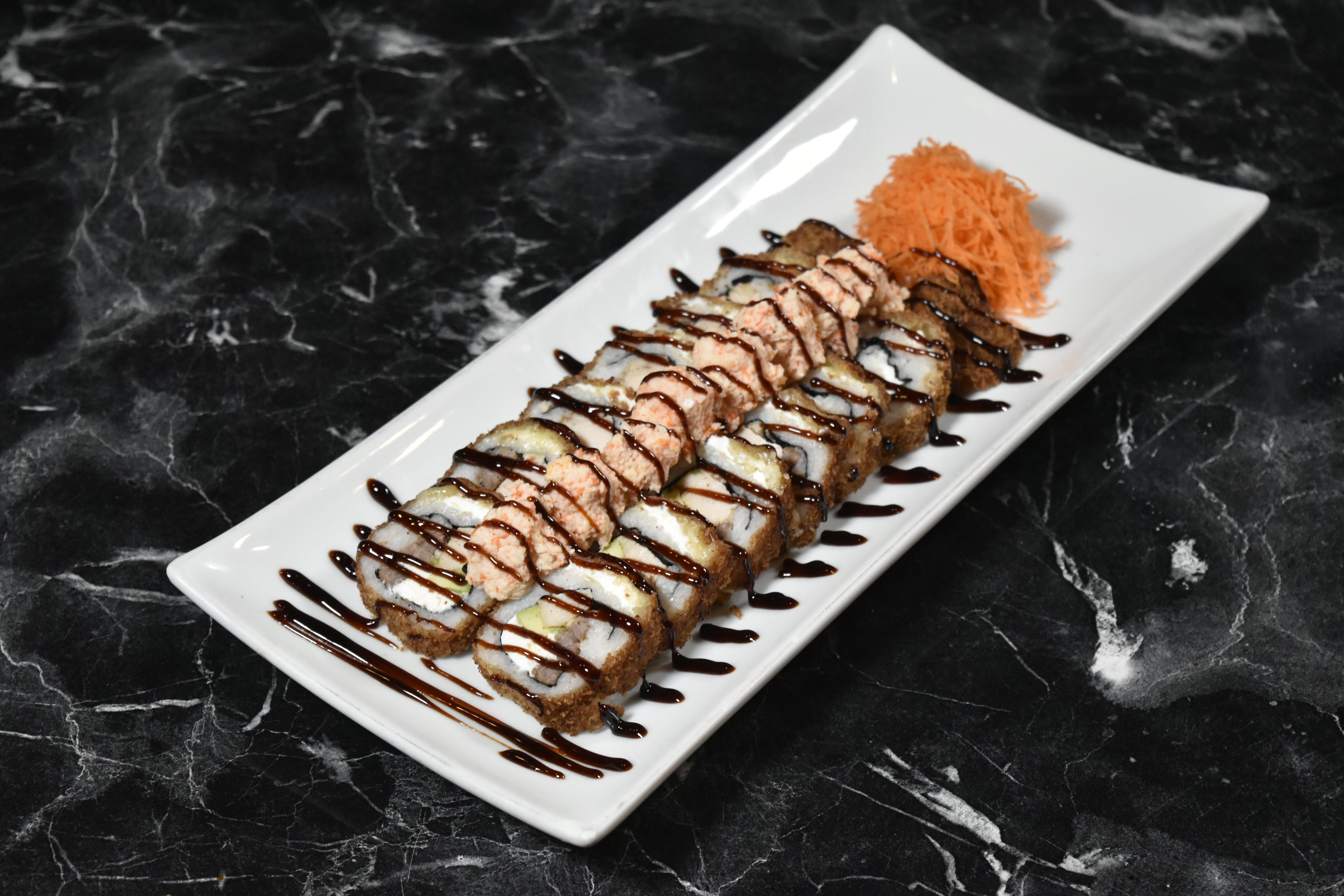 Cangrejo, queso philadelphia, aguacate, pepino por dentro, topping spicy ranch, con camarones empanizados y salsa de anguila.