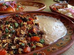 Huevos revueltos con carnitas, bañados en salsa verde, acompañados con frijol y tortillas de maíz.