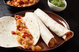 3 Burritos de machaca a la mexicana con tortilla de harina, acompañados de frijol y queso fresco.