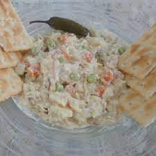 Sándwich de ensalada de pollo, bañado en crema de pimiento.
