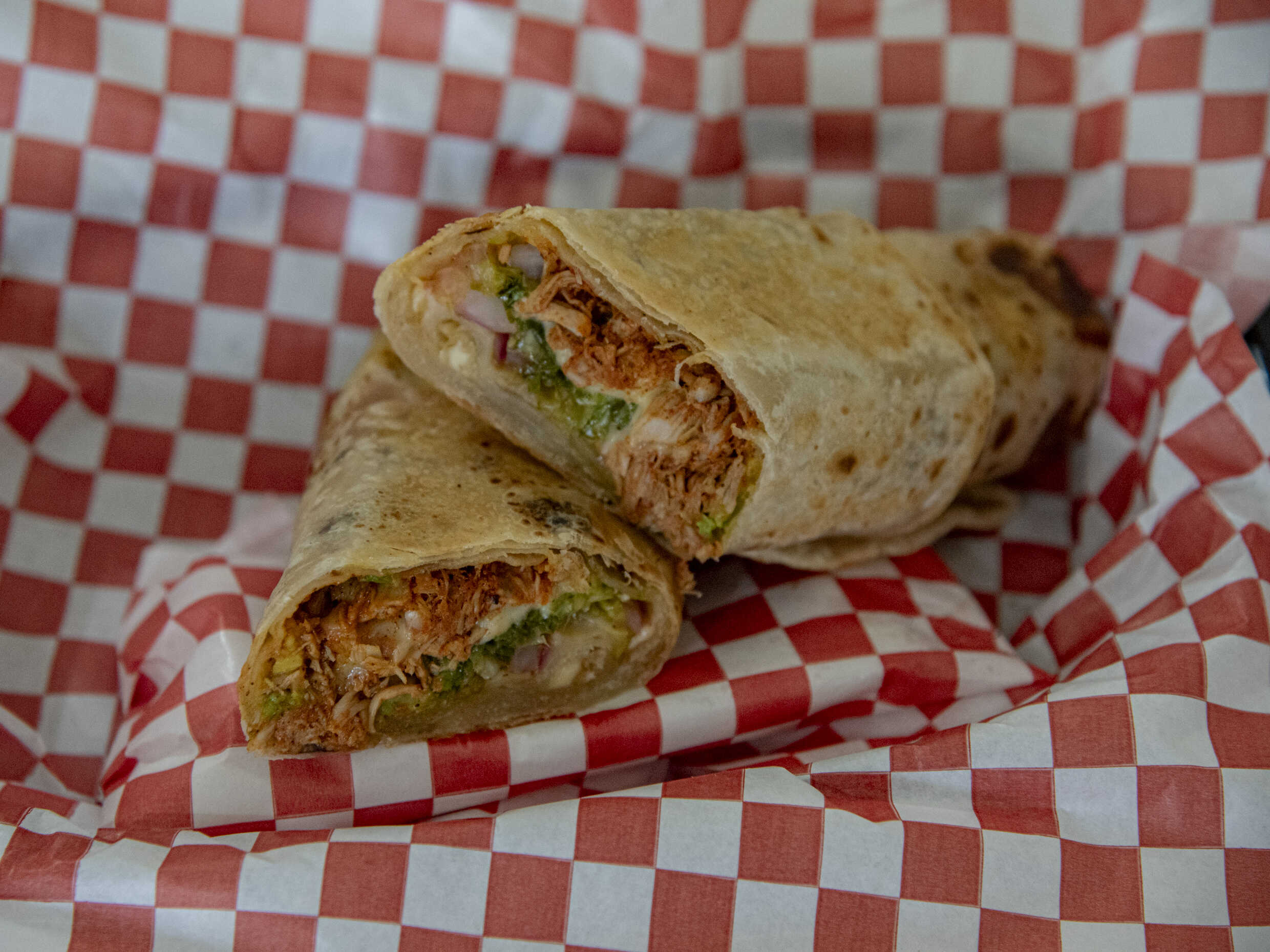 Delicioso burrito de tortillas de harina (2) hecha a mano, pechuga de pollo a la plancha guisada con cebolla, pimientos y queso gratinado.