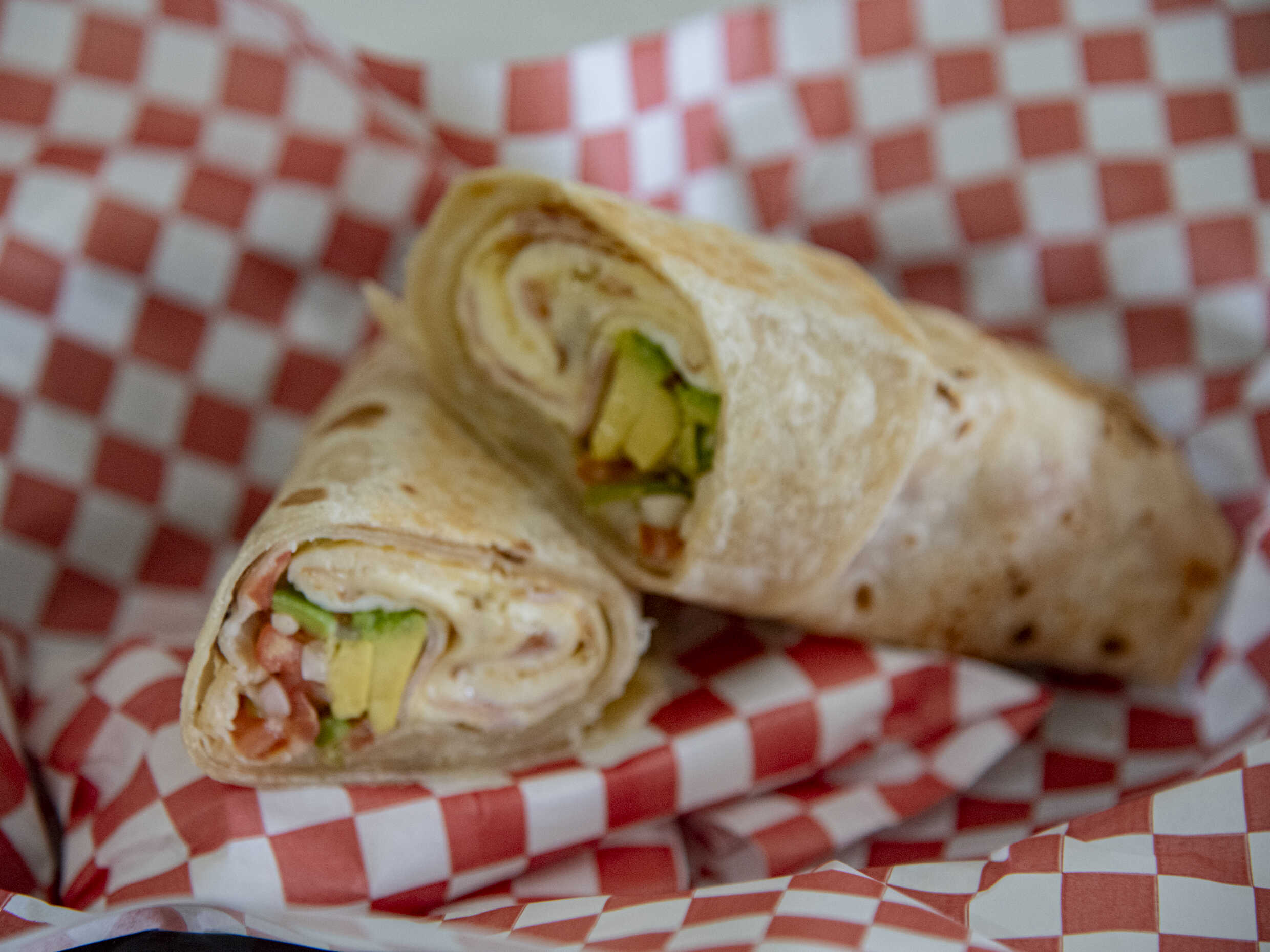 Delicioso burrito de tortillas de harina (2) hechas a mano, 2 huevos revueltos con jamón salsa bandera (tomate, cebolla, chile serrano), queso gratinado y aguacate.