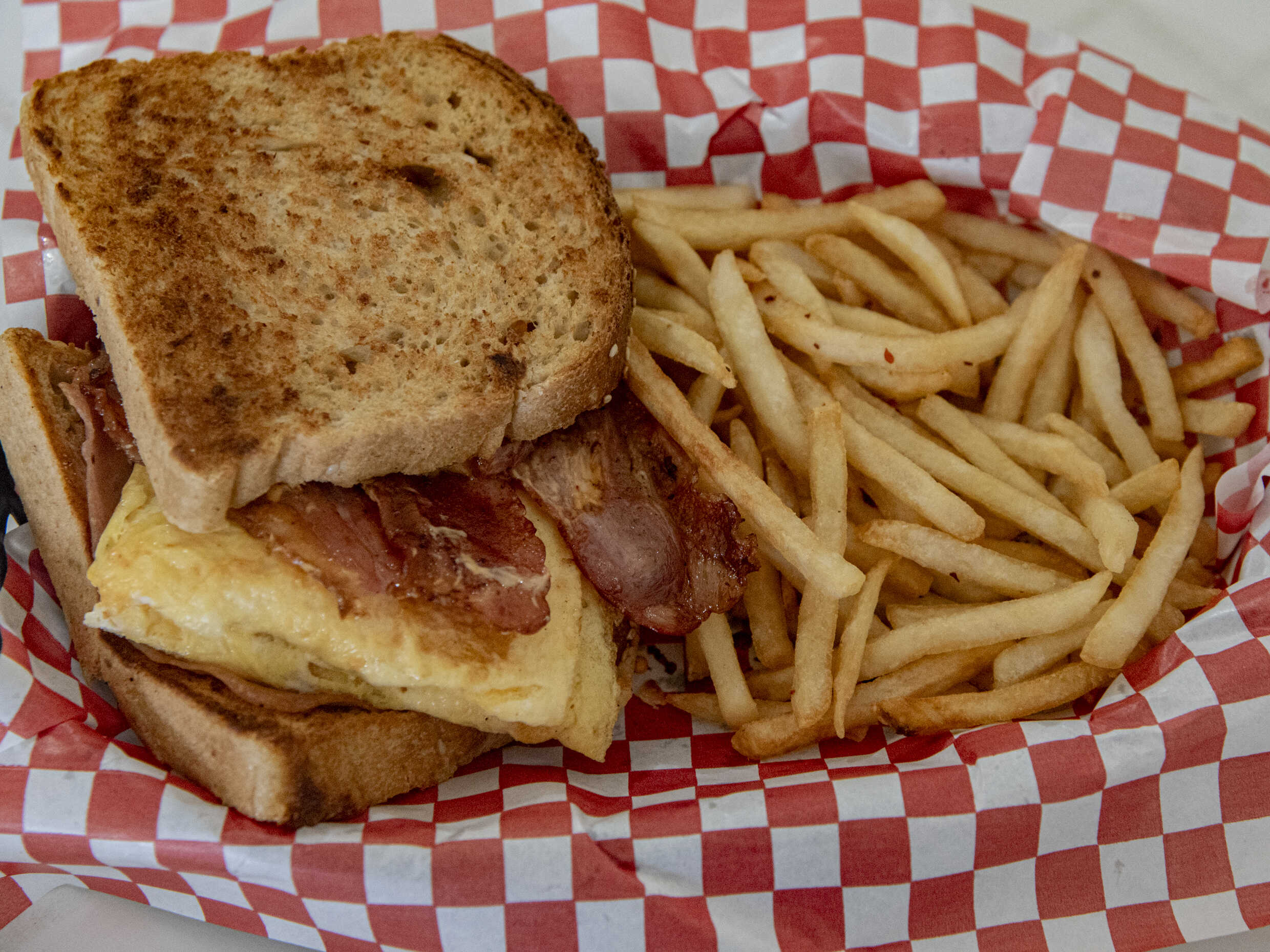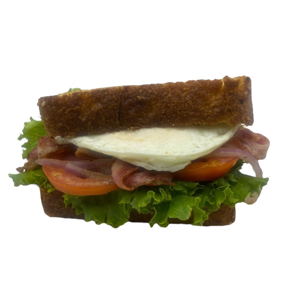 Delicioso pan de barra cortado al momento, un huevo estrellado, lechuga orejona, tomate, cebolla guisada, tocino y salsa roja picante