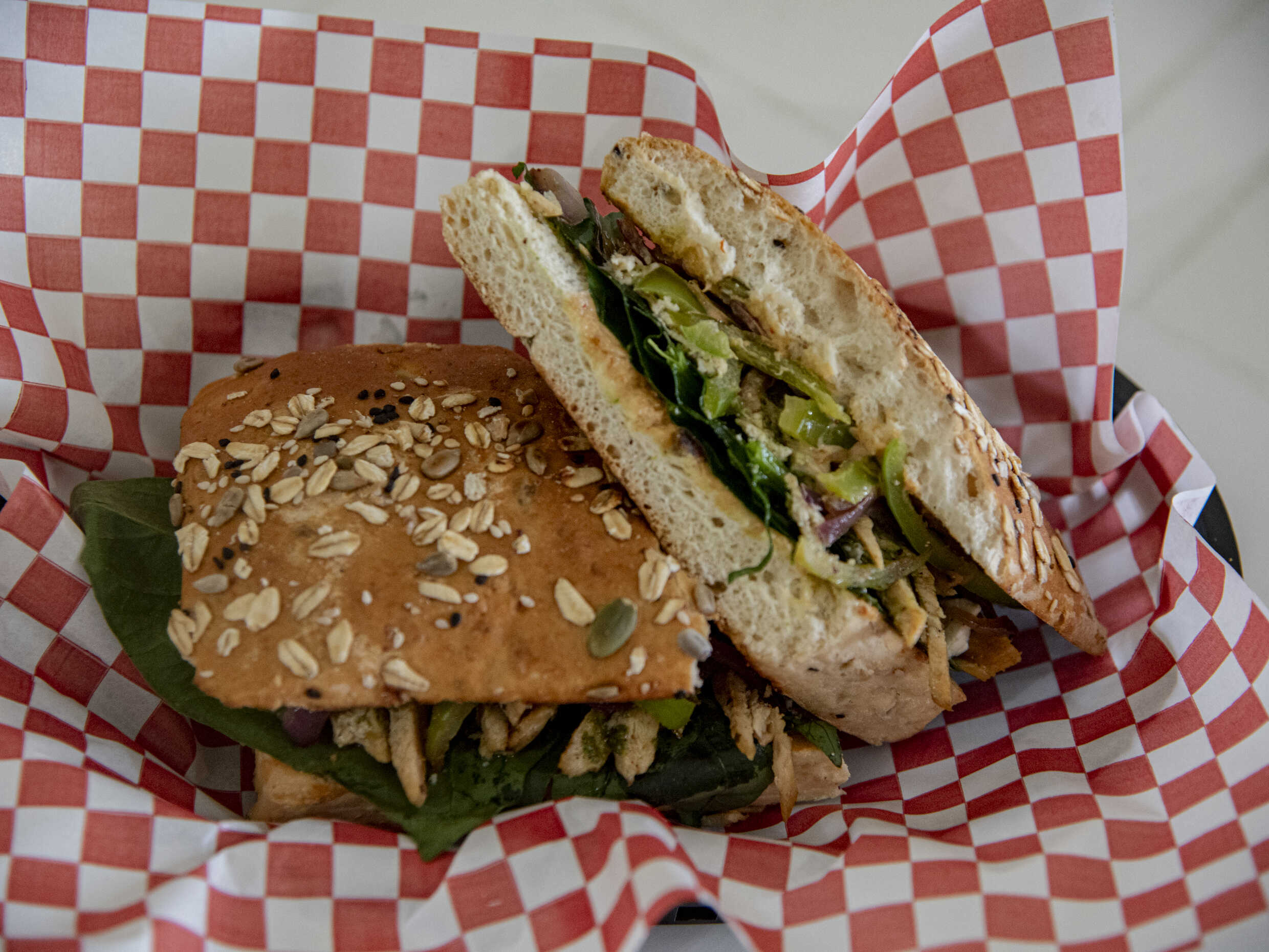 Delicioso pan panini cortado al momento, pollo a la plancha, pimientos, cebolla guisada, pesto, queso de cabra y aderezo chipotle