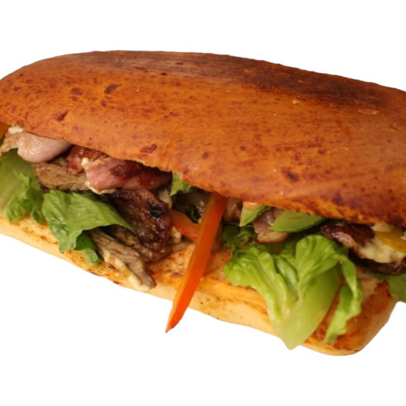Delicioso pan panini cortado al momento, fajitas de carne sirloin, tocino, cebolla guisada, champiñón, pimientos, aguacate, lechuga orejona, queso gratinado y aderezo chipotle.