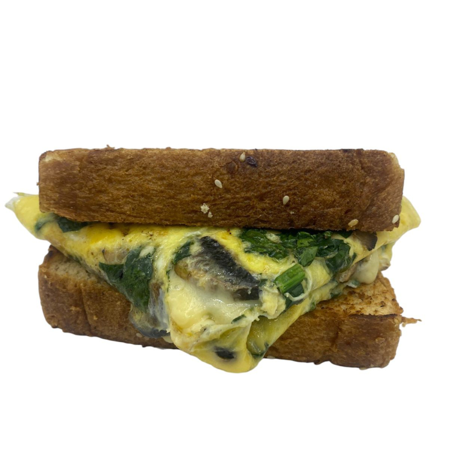Delicioso pan de barra cortado al momento, torta de huevo, espinacas, champiñón, queso gratinado y aderezo chipotle.