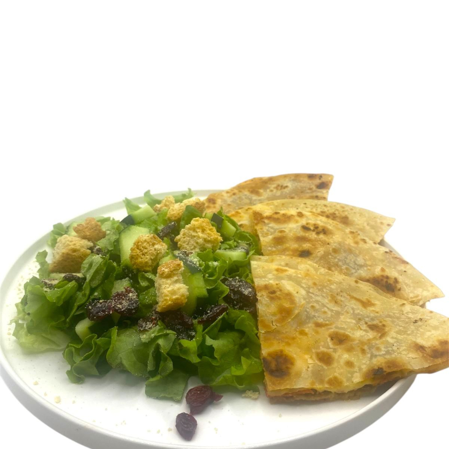 Deliciosas quesadillas de tortillas de harina (2) hechas a mano, queso amarillo, queso americano y jamón. Incluye guarnición de ensalada (mix lechuga, pepino, arándanos, crotones y aderezo ranch).