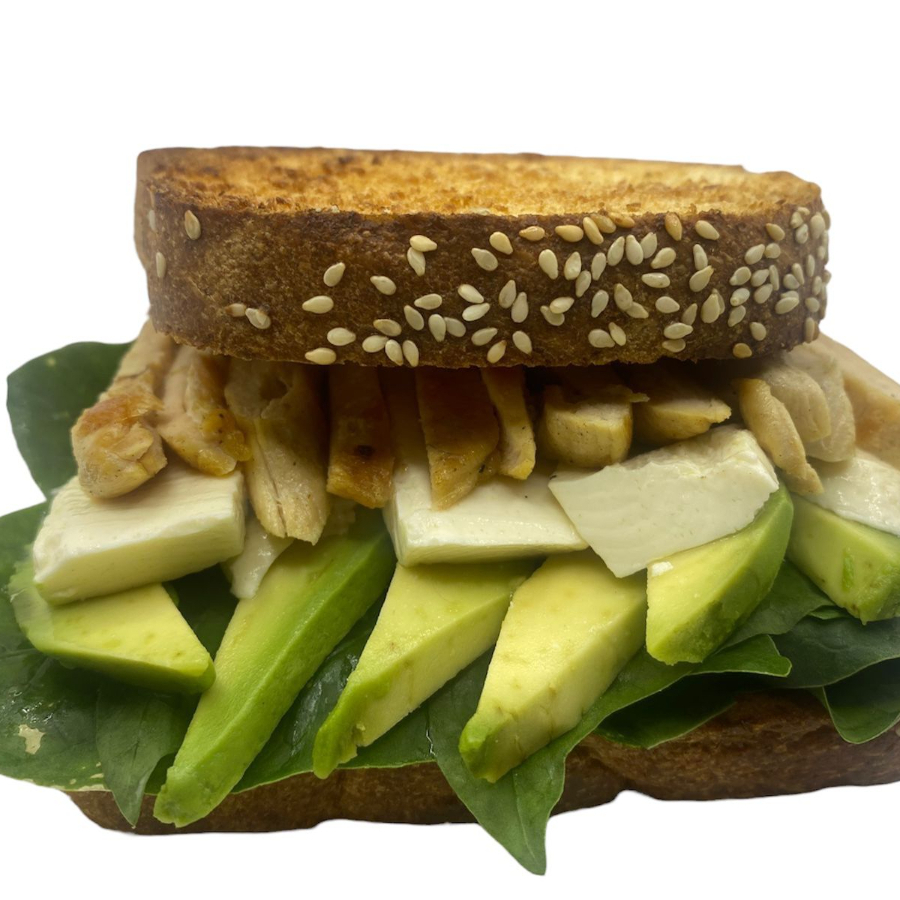 2 barras de pan cortado al momento, pollo a la plancha, panela, aguacate, espinaca y aderezo chipotle