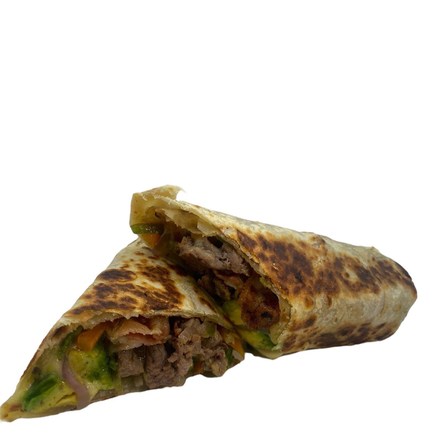 Delicioso burrito de tortillas de harina (2) hechas a mano, fajitas de carne sirloin, tocino, aguacate, cebolla, pimientos y queso gratinado.