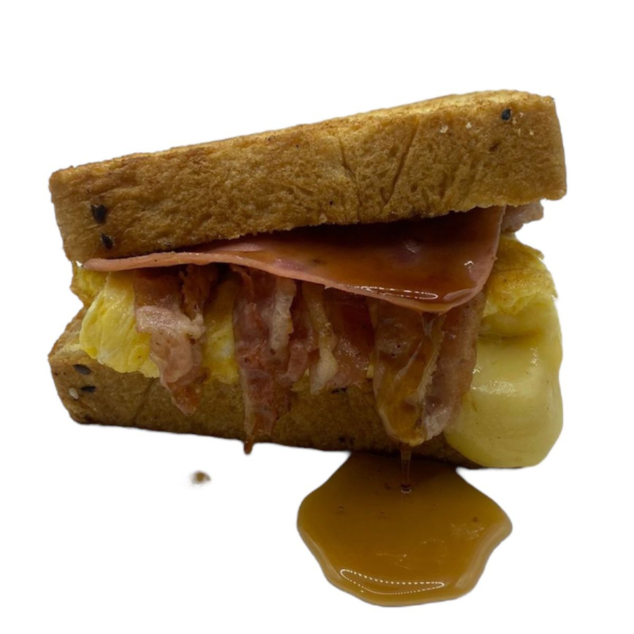 2 Huevos revueltos, tocino, jamón, queso Gratinado y Miel Maple