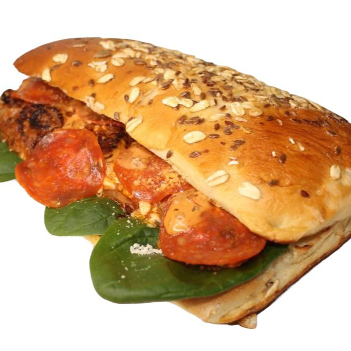 Delicioso pan panini cortado al momento, carne molida con salsa de tomate, champiñón, pepperoni, espinacas, queso parmesano, queso gratinado y aderezo chipotle