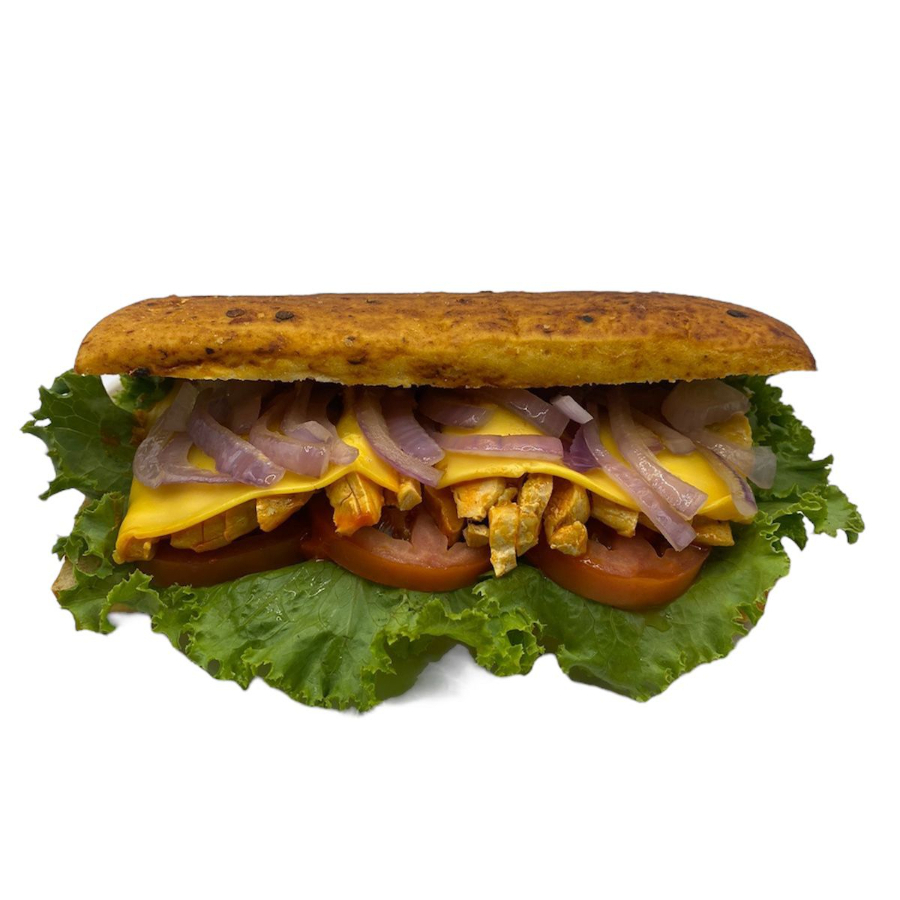 Delicioso pan de barra cortado al momento, lechuga orejona, pechuga de pollo a la plancha, tomate, cebolla guisada, queso gratinado, aderezo chipotle.