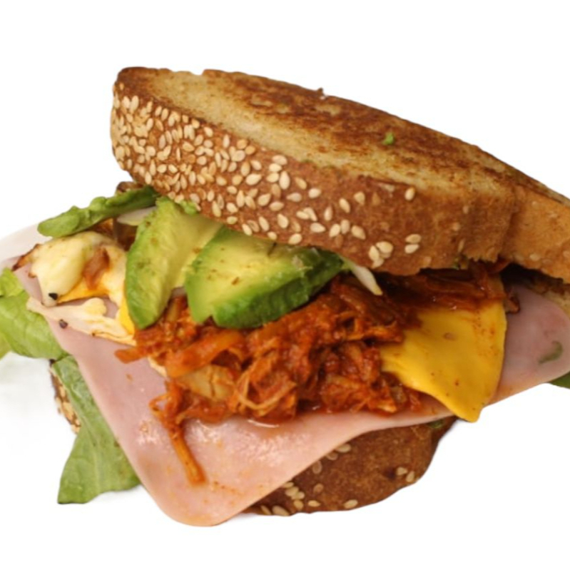 Delicioso pan de barra cortado al momento, cochinita de la casa, lechuga orejona, jamón, queso americano, queso gratinado, aguacate y aderezo chipotle.