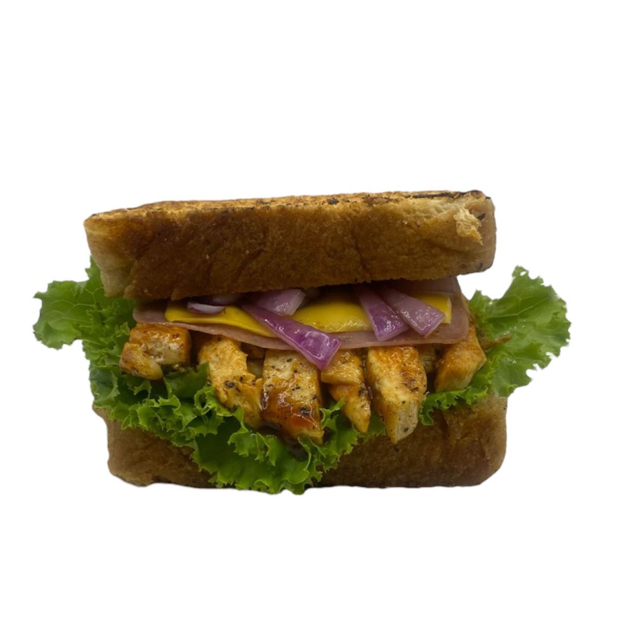 Delicioso pan panini cortado al momento, lechuga orejona, tomate, cebolla guisada, pechuga de pollo a la plancha, queso parmesano, queso gratinado y aderezo chipotle.