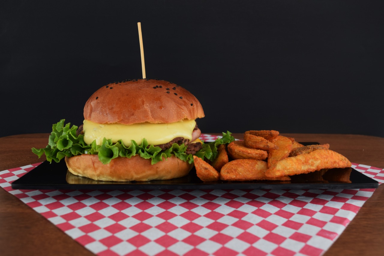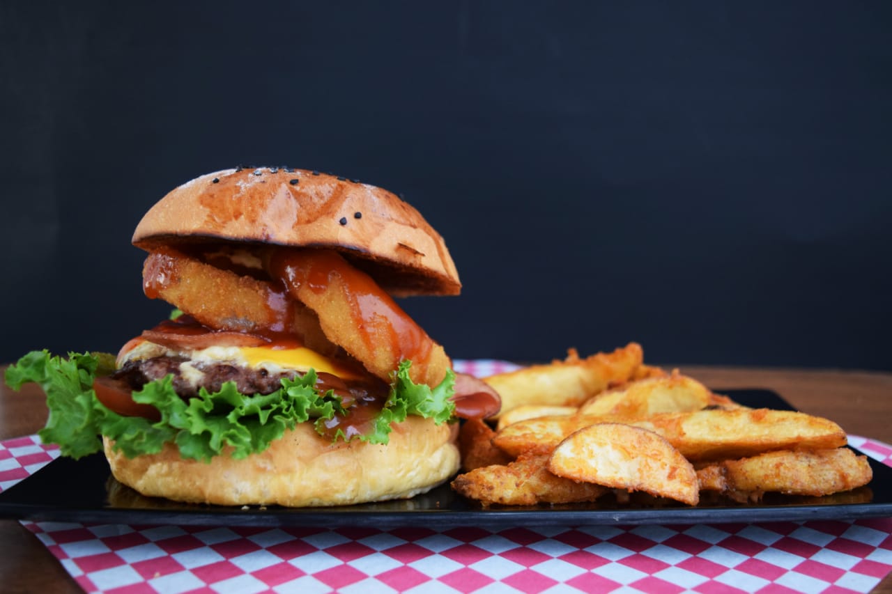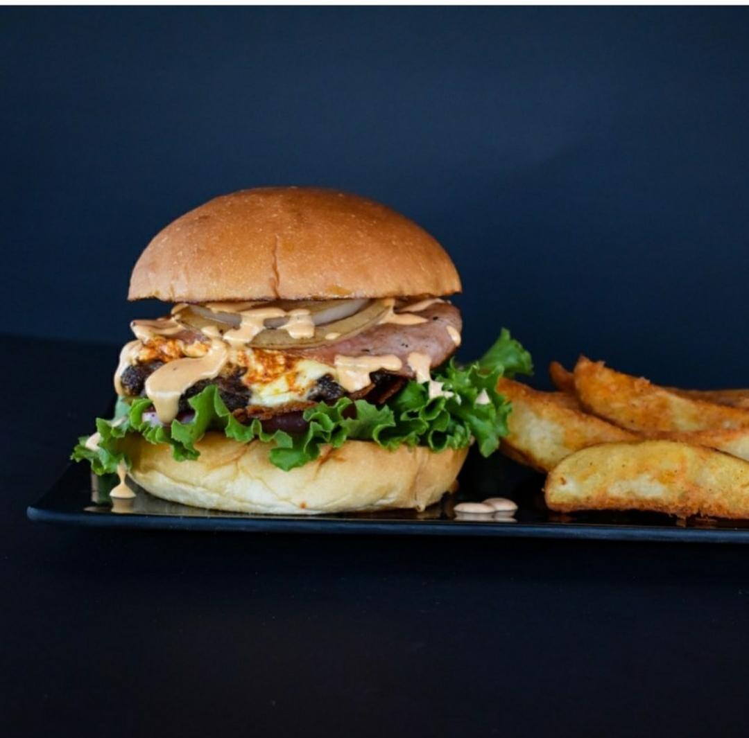 Carne de res 230 gr, falda de queso Chihuahua gratinado, doble americano, doble tocineta, cebolla caramelizada burgers.