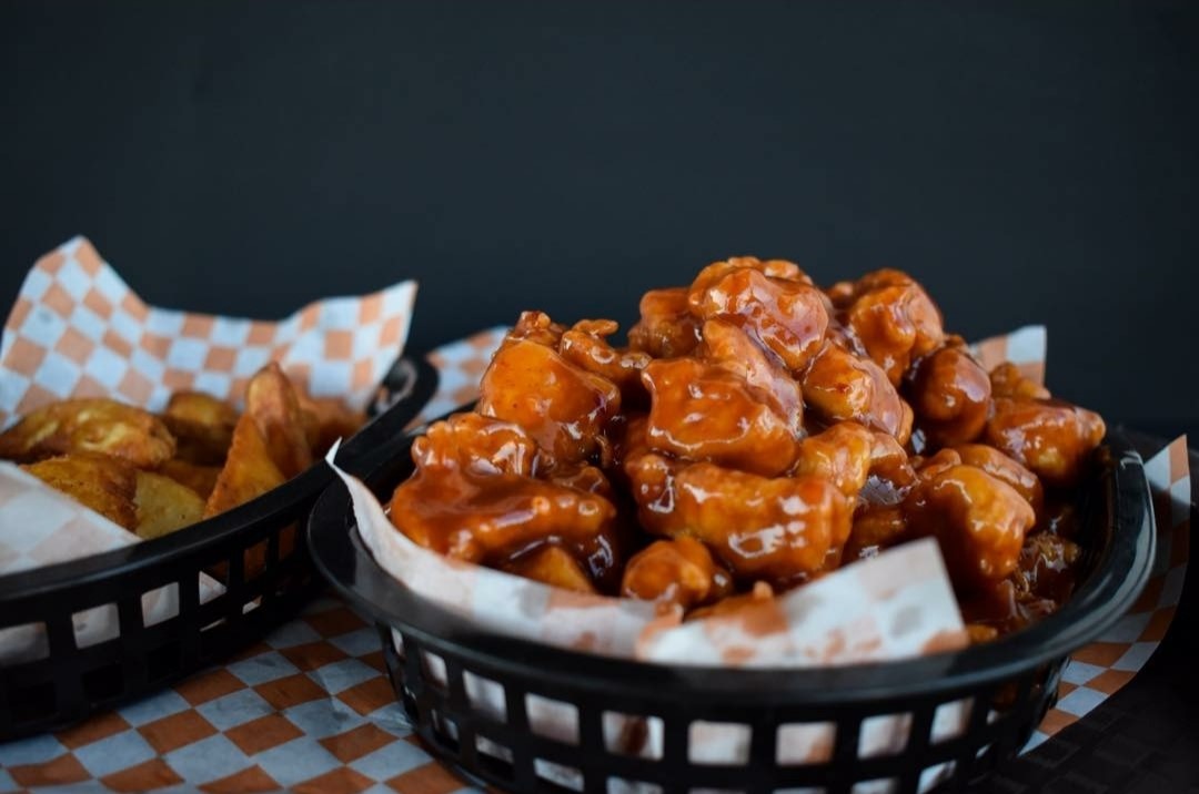 500 gr de boneless bañados en salsa acompañados de papa gajo y aderezo.