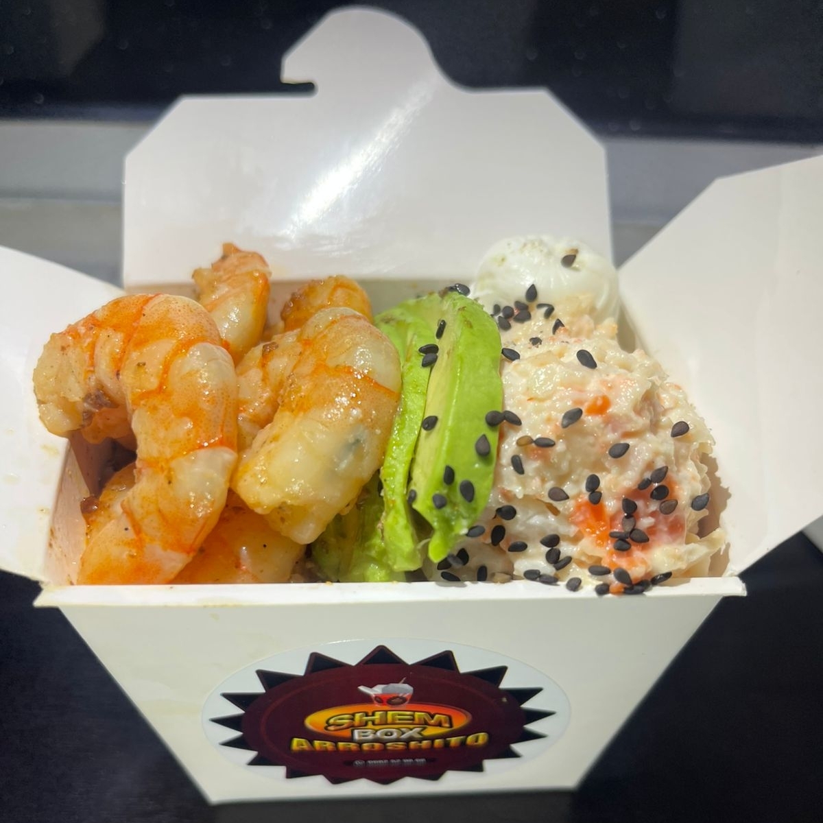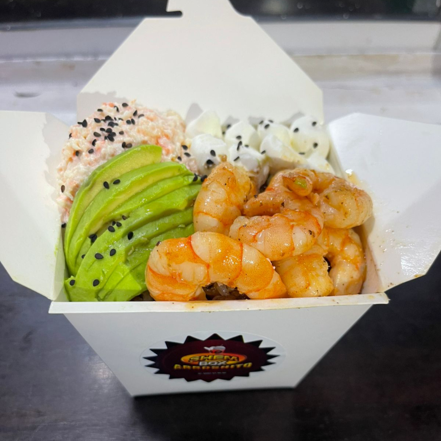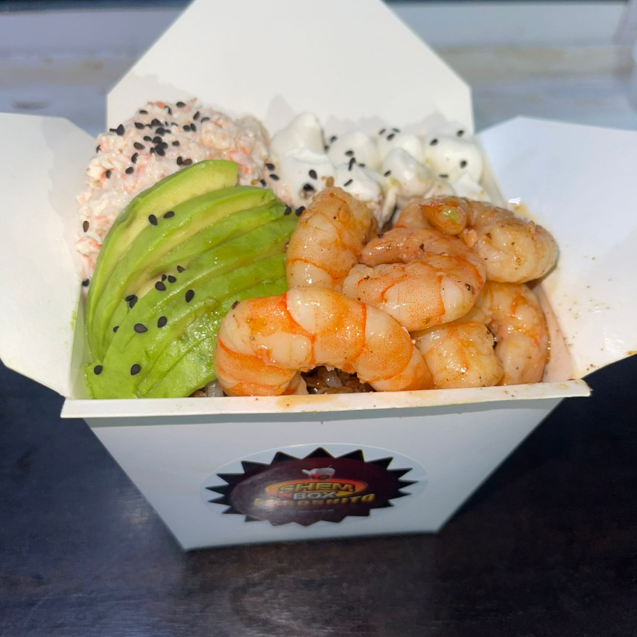 Prueba nuestra caja de 32oz: base de arroz, camarón al grill, capa de surimi con ajonjolí, aguacate y chipotle.