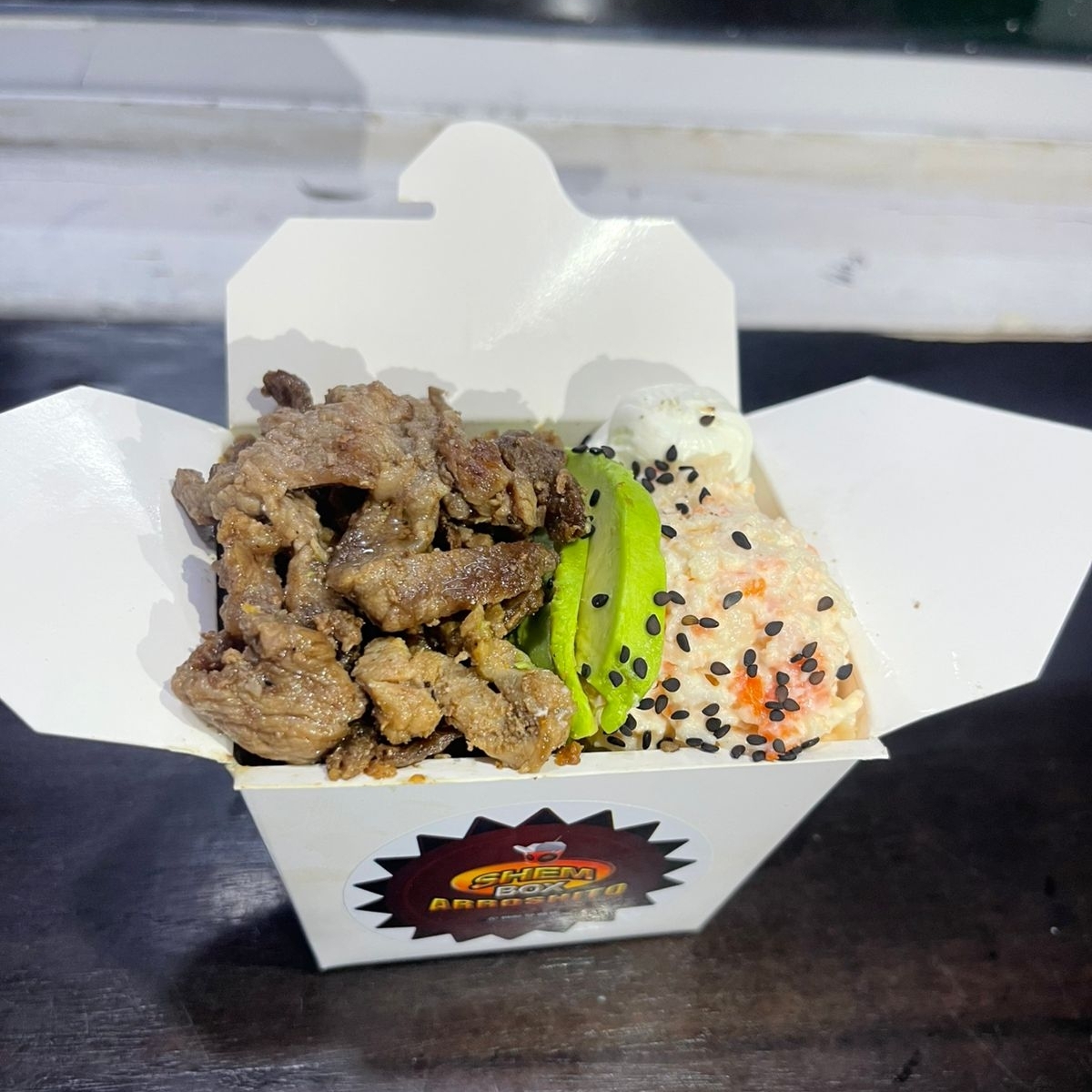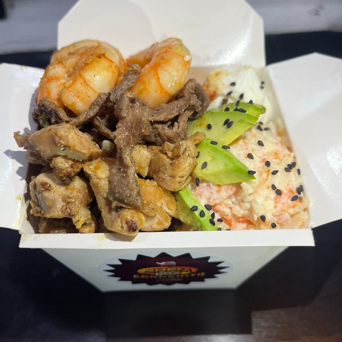 Disfruta una caja de 32oz con arroz, jugosa res a la plancha, surimi al ajonjolí, aguacate y toque de chipotle.