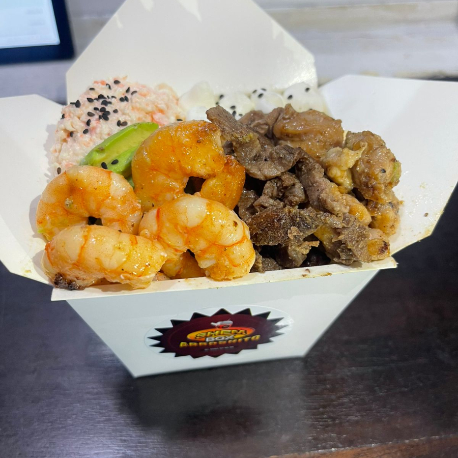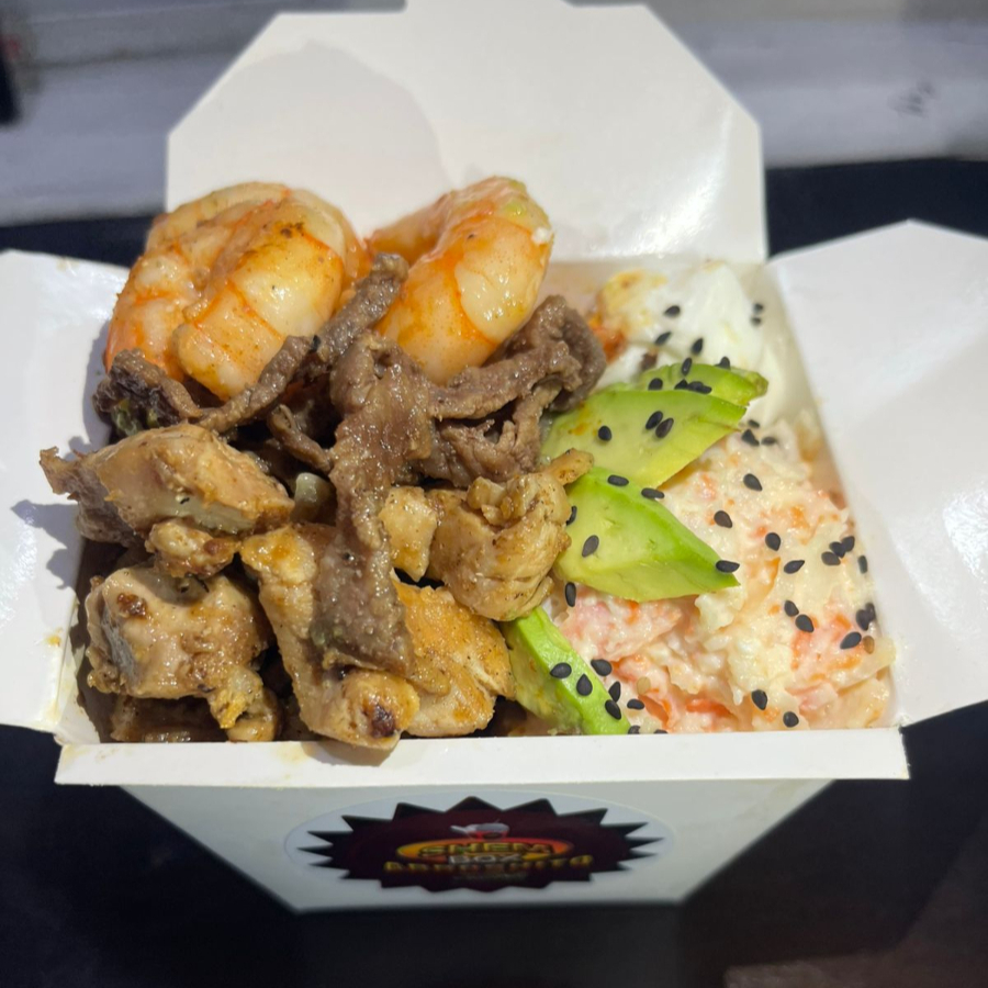 La experiencia completa en caja de 32oz: arroz, proteínas mixtas, surimi con ajonjolí, aguacate y chipotle.