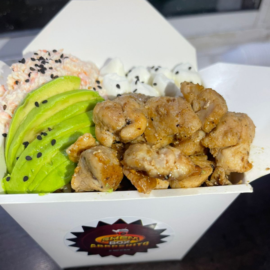 La combinación perfecta en caja de 16oz: arroz, proteínas mixtas, surimi con ajonjolí, aguacate y chipotle.
