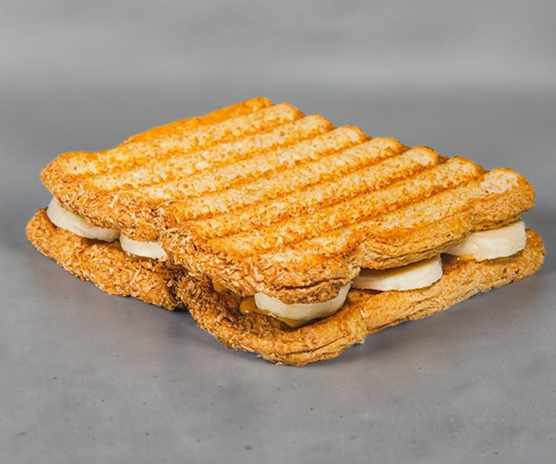 Sándwich hecho con crema de cacahuate, plátano y miel de abeja.
