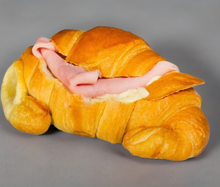 Croissant hecho con jamón de pavo, queso y mantequilla.