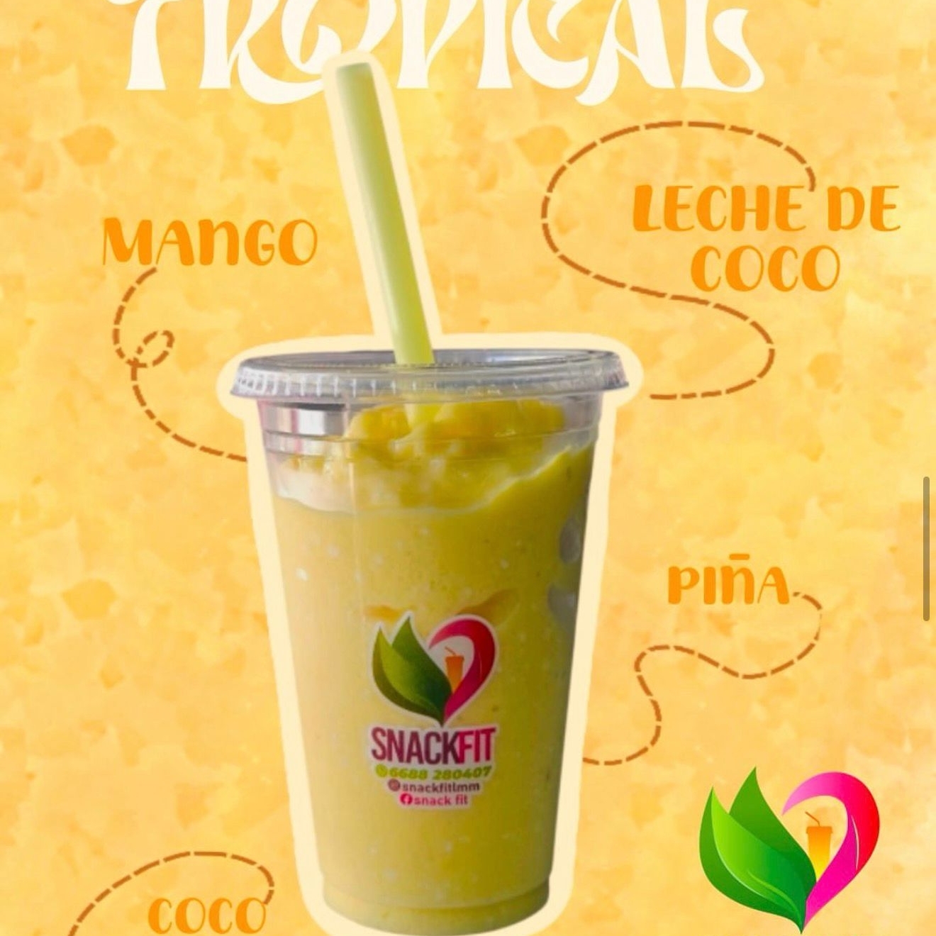 Smoothie hecho con mango, piña, coco rallado y leche de coco.