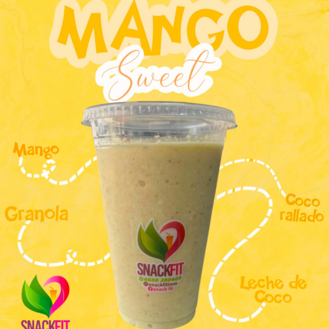 Smoothie hecho con mango, granola, coco rallado y leche de coco.