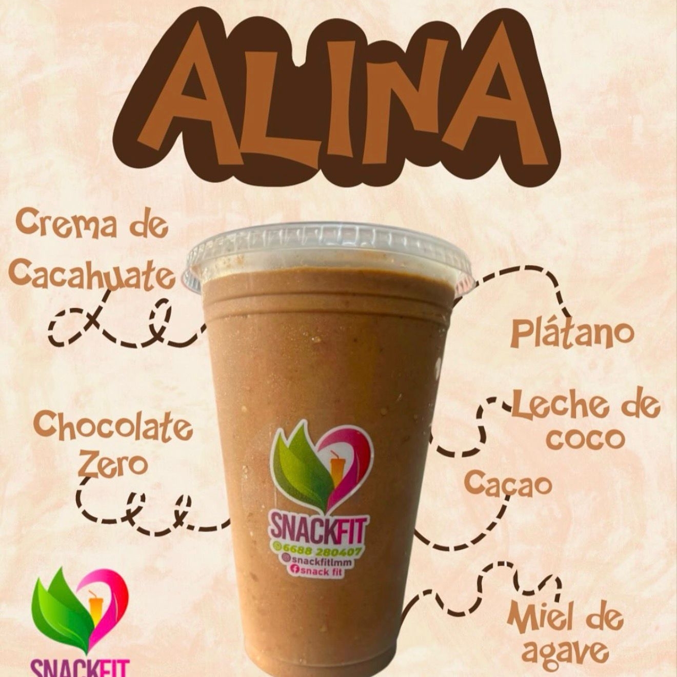Smoothie hecho con plátano, cacao, canela, miel de abeja, café, crema de cacahuate, granola y leche a elegir.