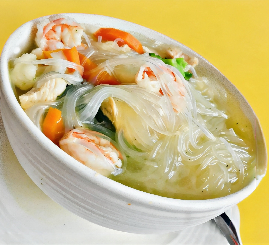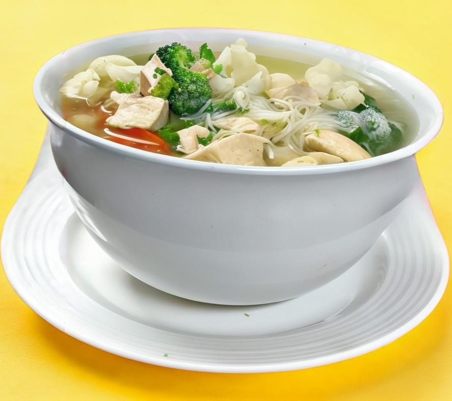 Pollo y camarón, brócoli, zanahoria y coliflor.