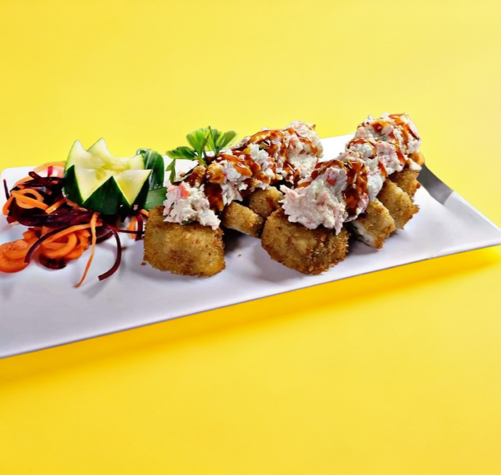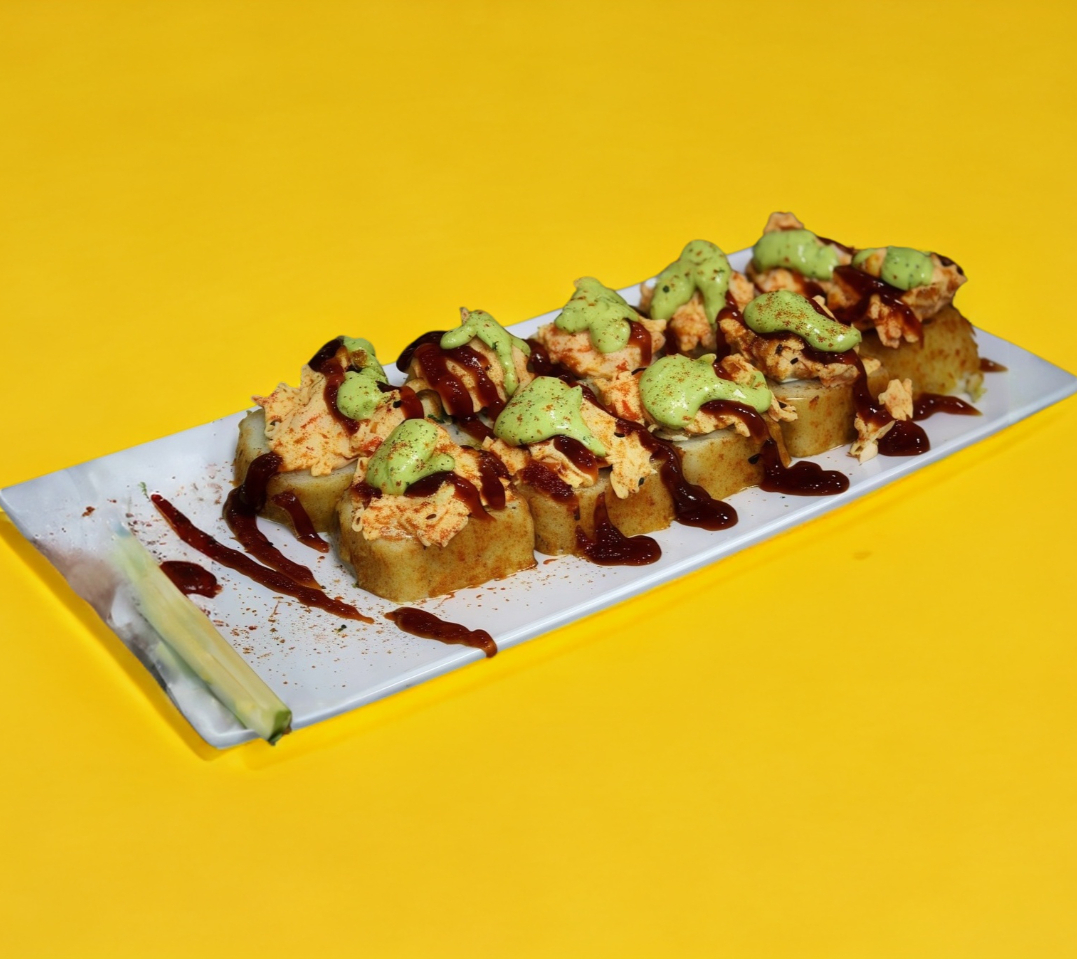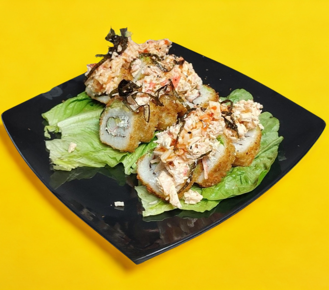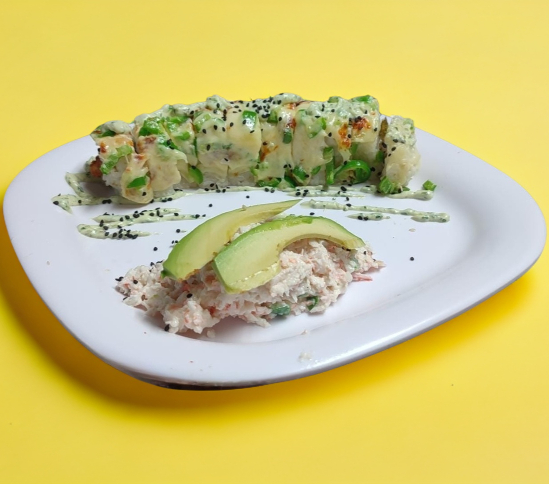 Tampico, forrado de cangrejo, aguacate bañado en salsa de cilantro y ajonjolí con topping de ensalada de cangrejo spicy.