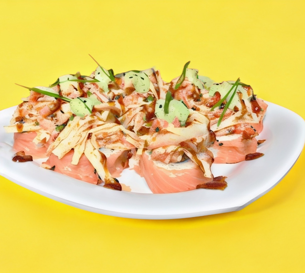 Tampico, forrado de salmón bañado en salsa de cilantro, salmón empanizado y ajonjolí.